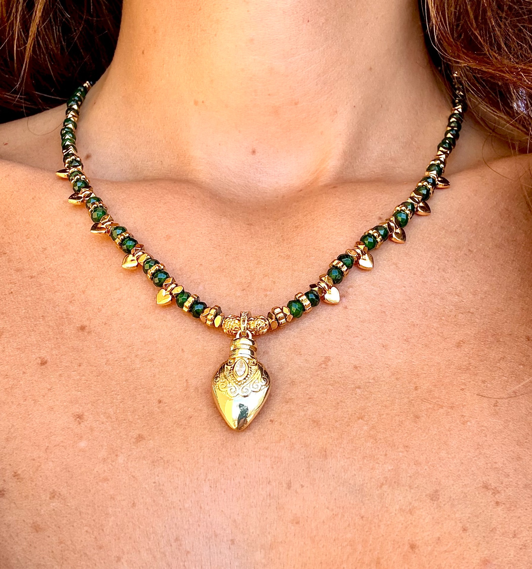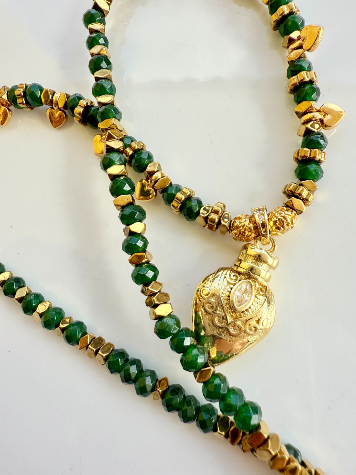 Pedras ágatas verdes. hematites e mini pendentes coração com banho de ouro 18Kt. Pendente coração com zircónias brancas.
