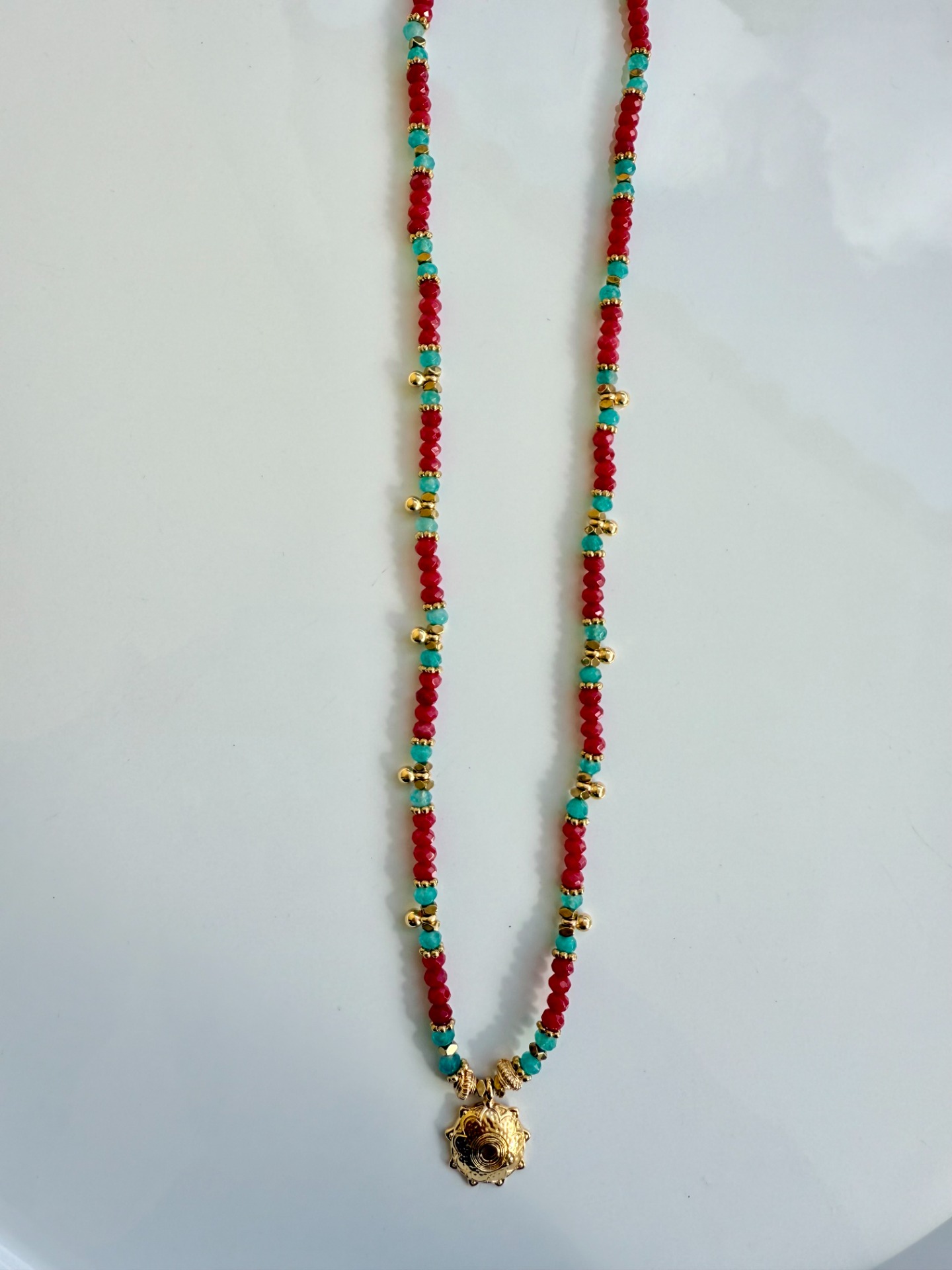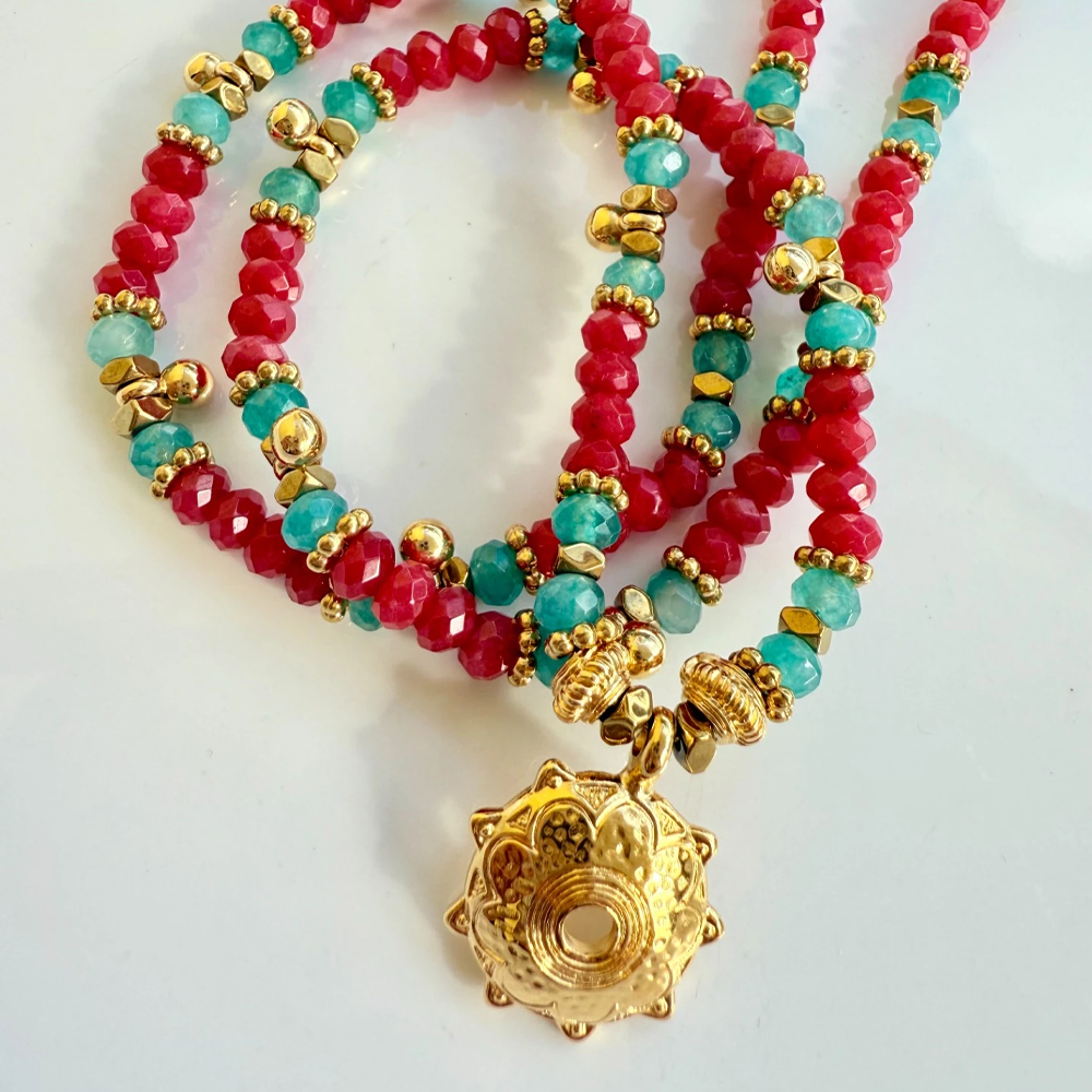 Pedras ágatas encarnadas e amazonites. Hematites, pendentes bolinhas e pendente sol tribal com banho de ouro 18Kt.