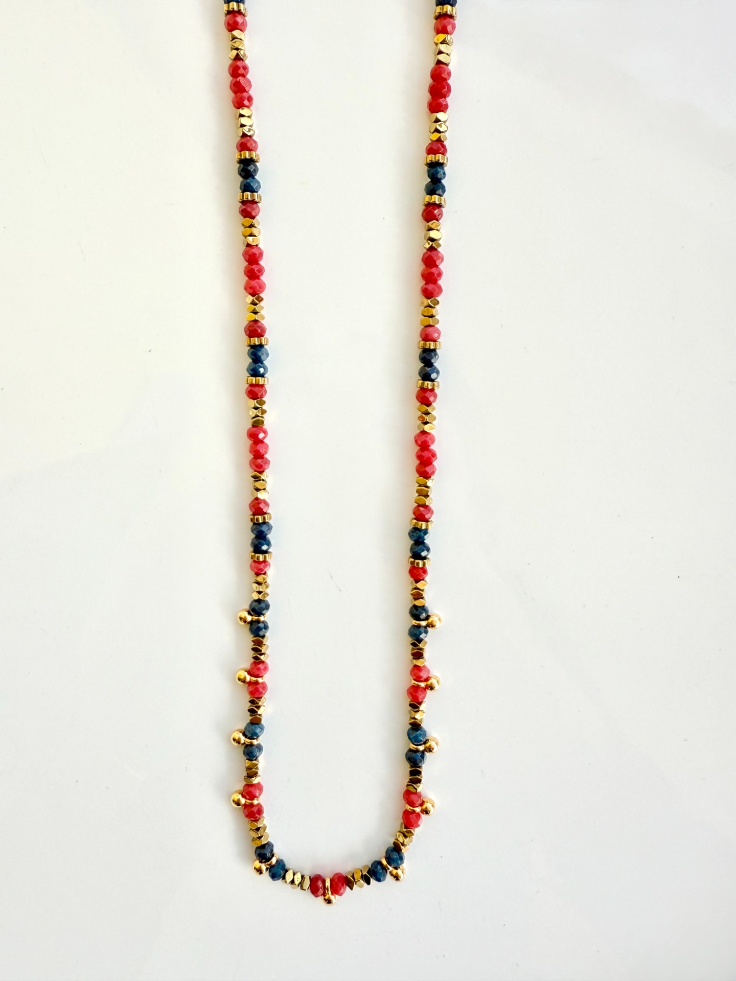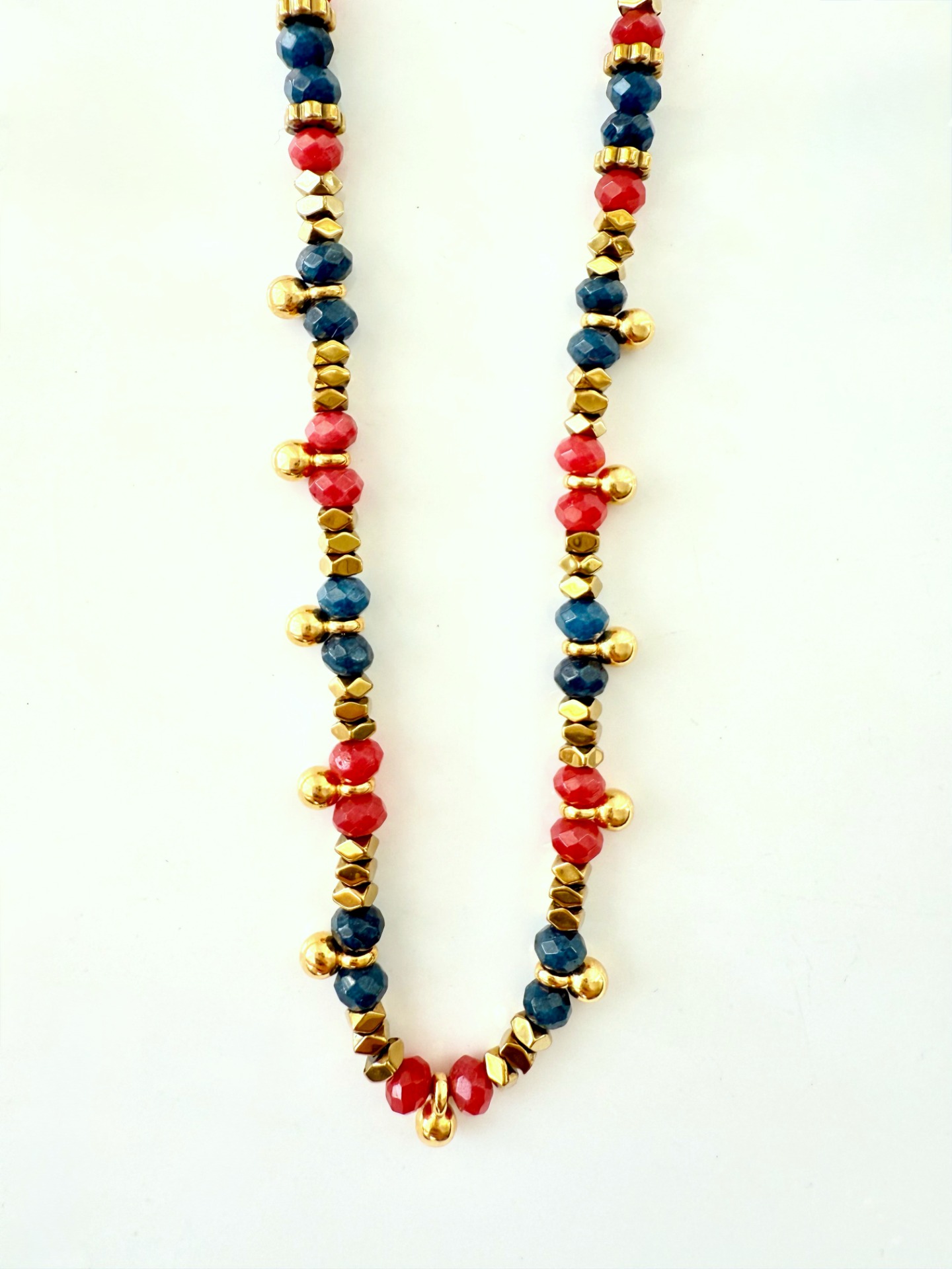 Ágatas encarnadas, lápis lazuli, hematites e pendentes bolinha com banho de ouro 18Kt.