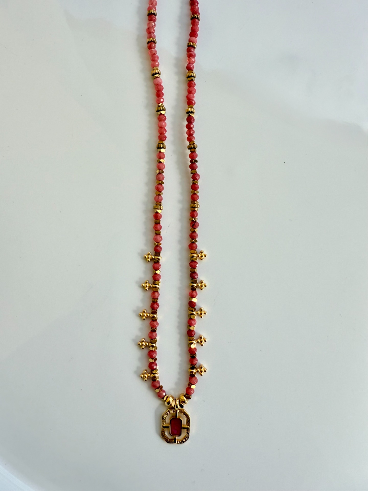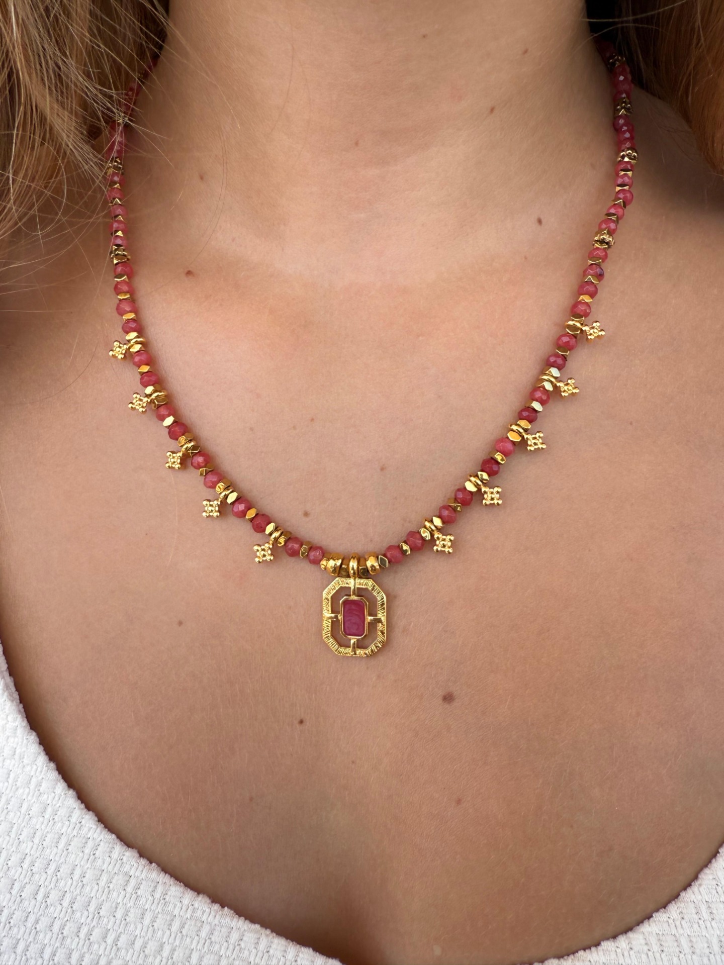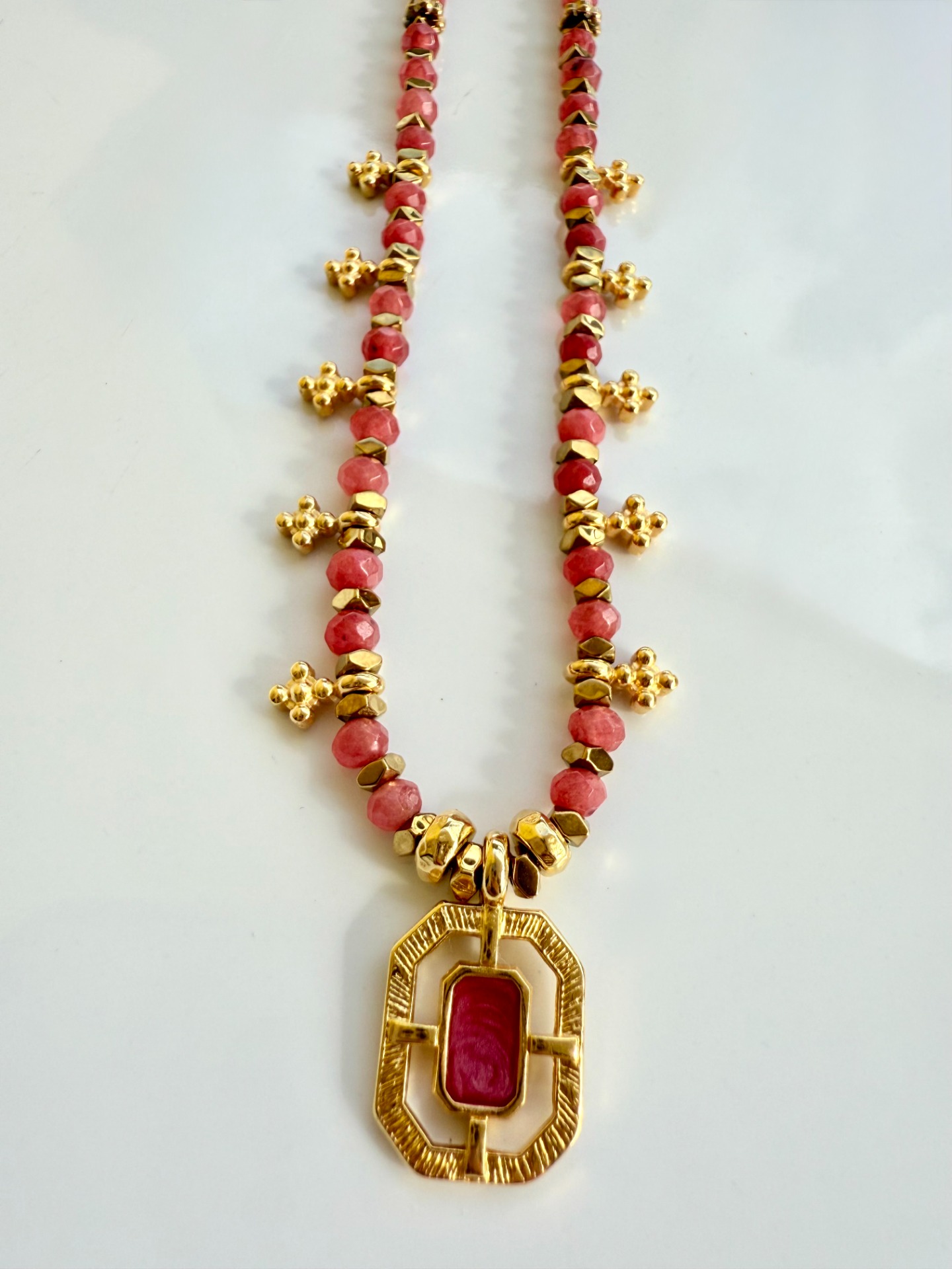 Pedras jade cor de rosa. Hematites, mini pendentes cruzinha e pendente alvo zamak com banho de ouro 18Kt.
