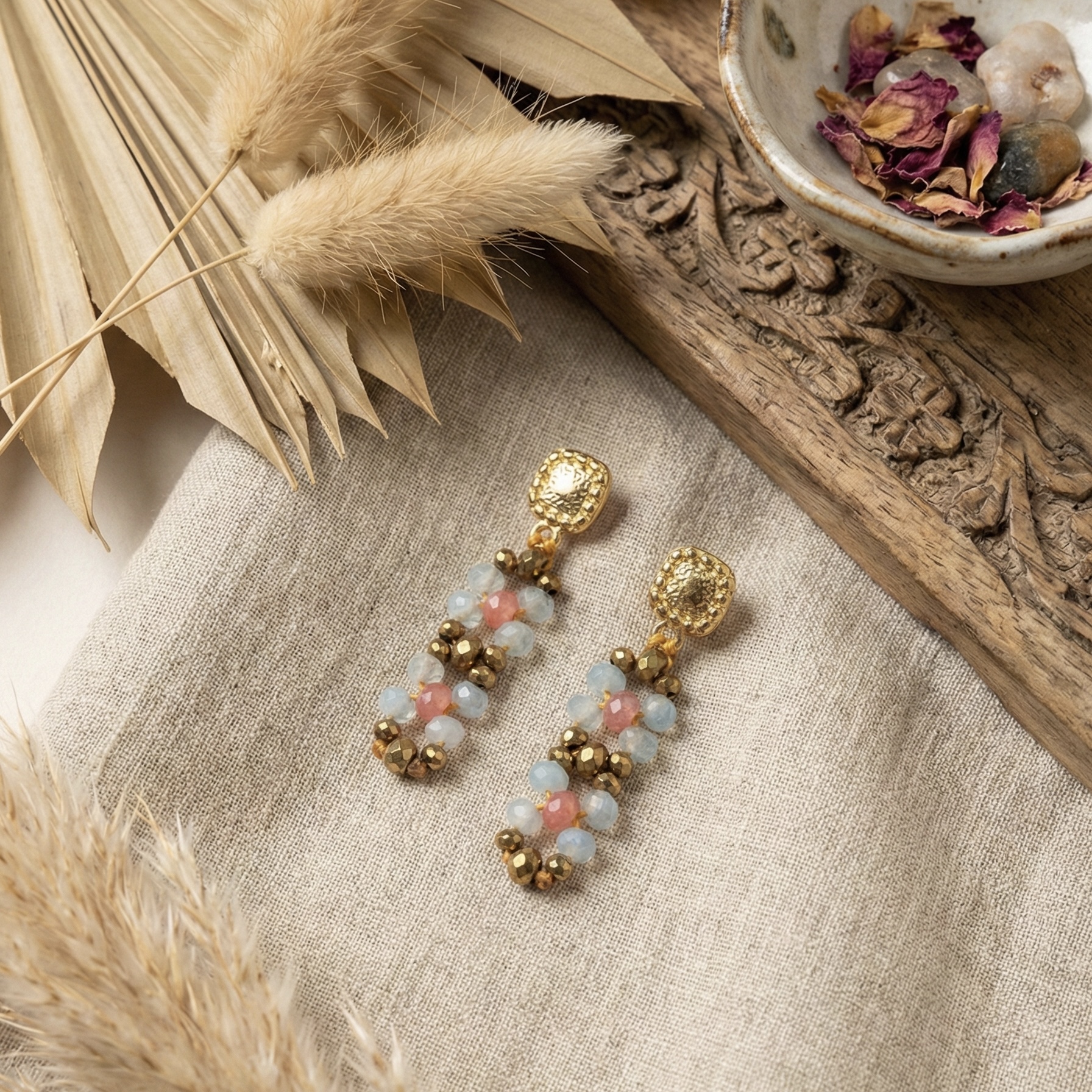 Pedras naturais água marinha e sunstone. Hematites e zamak com banho de ouro 18Kt.