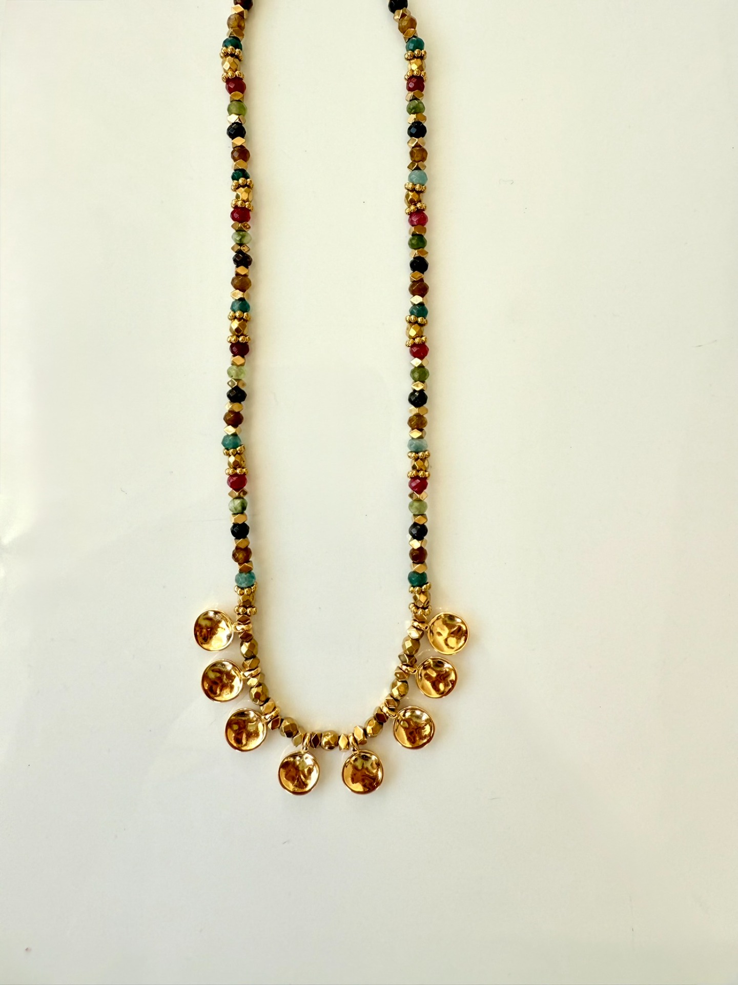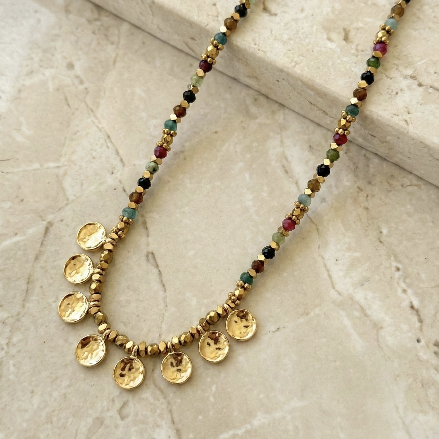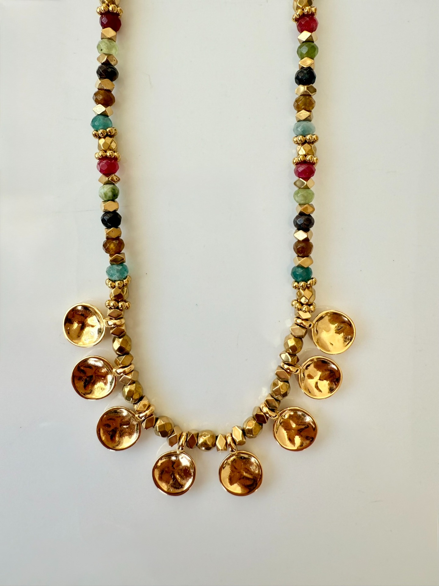 Pedras semi preciosas turmalinas, hematites e pendentes em zamak com banho de ouro 18Kt.