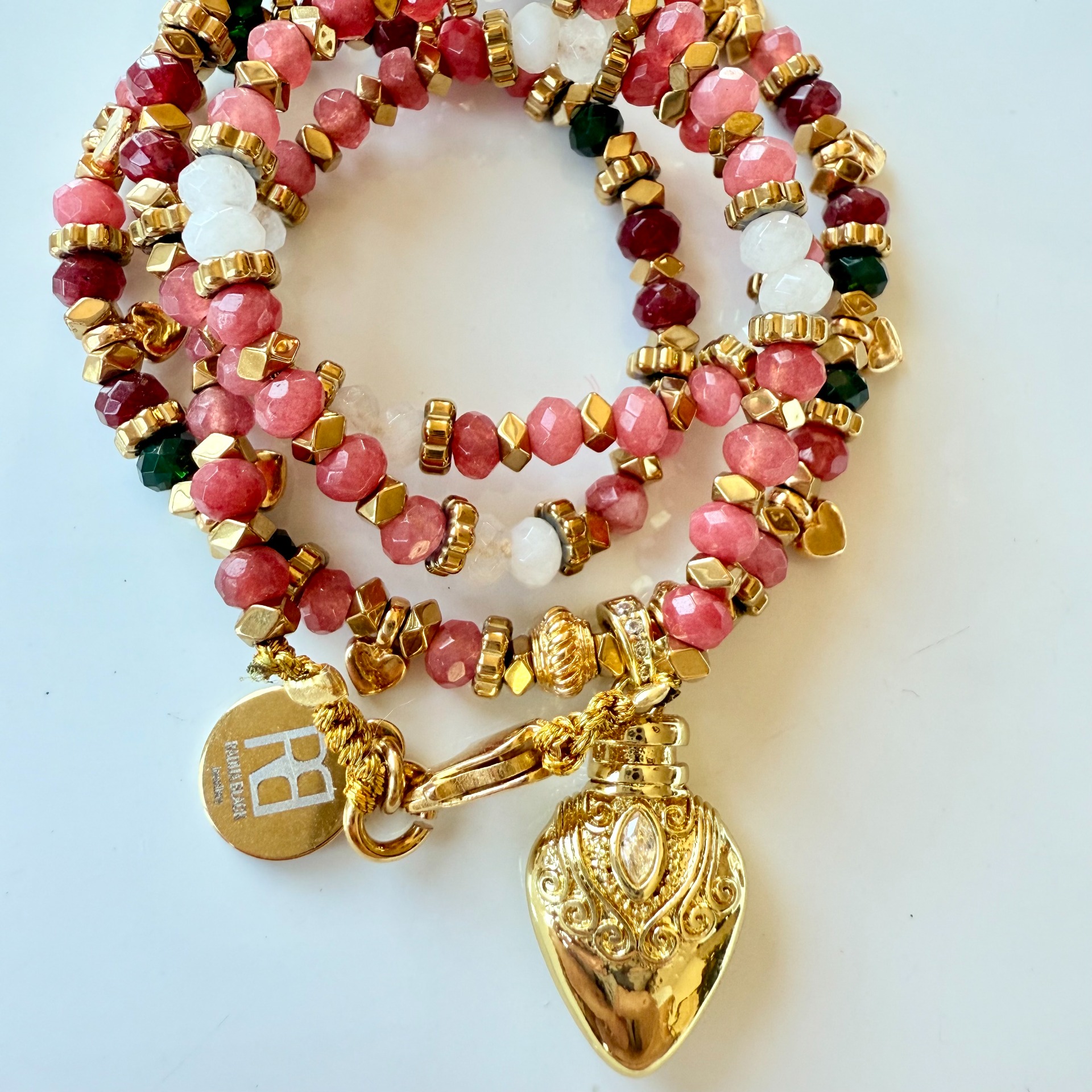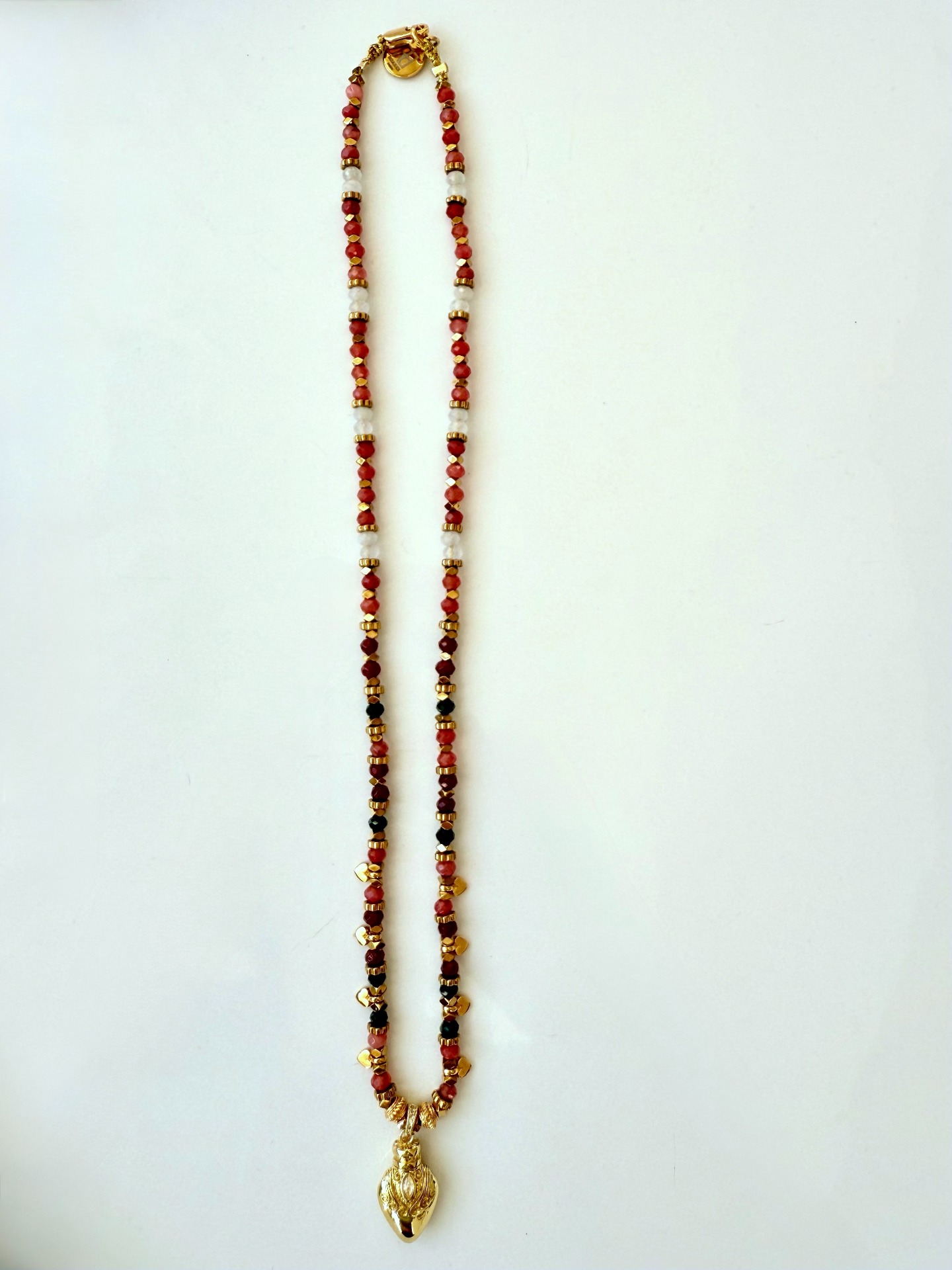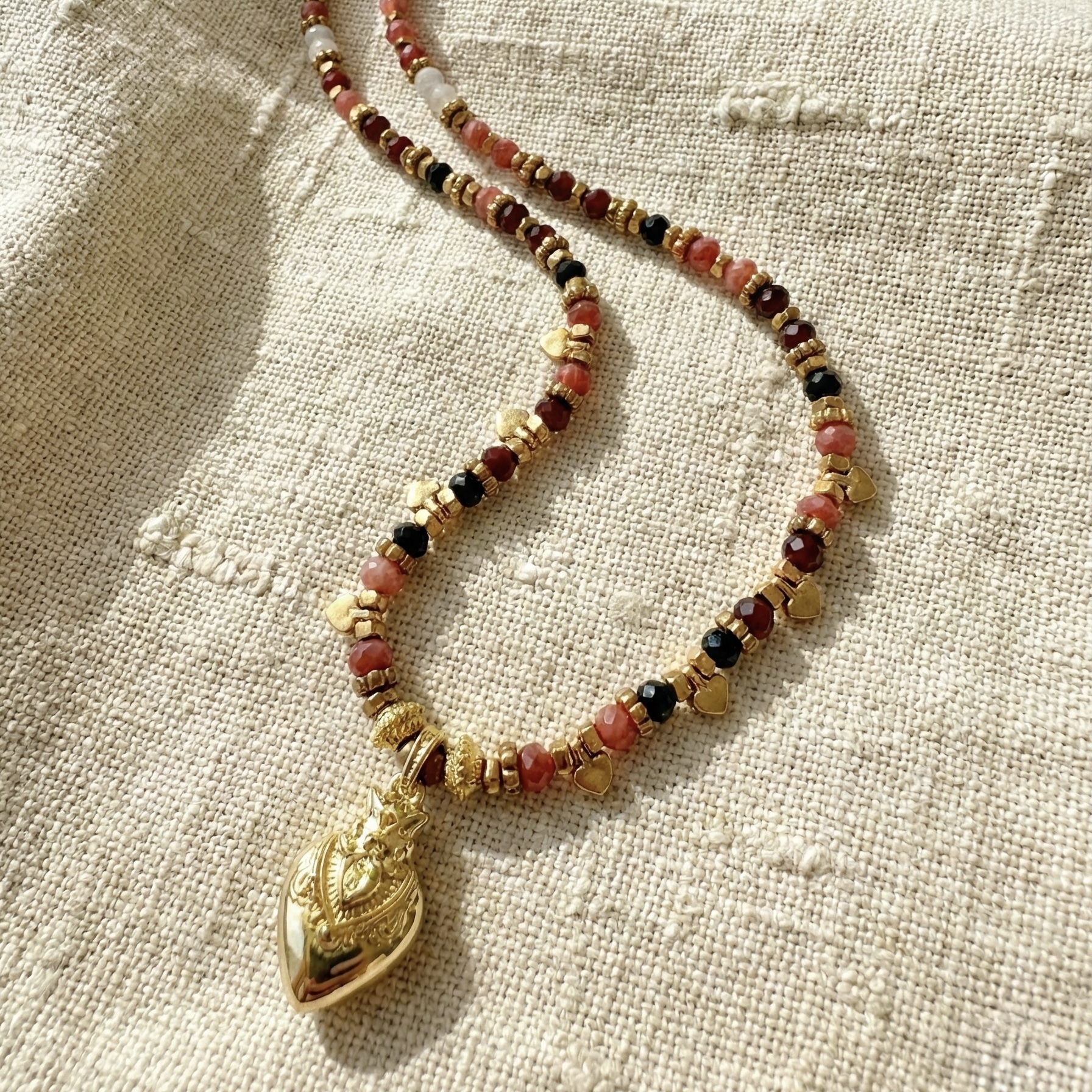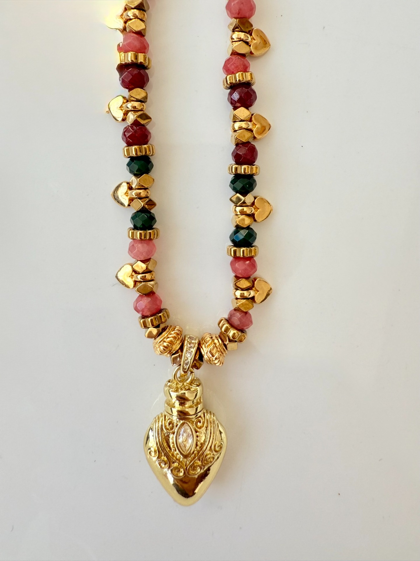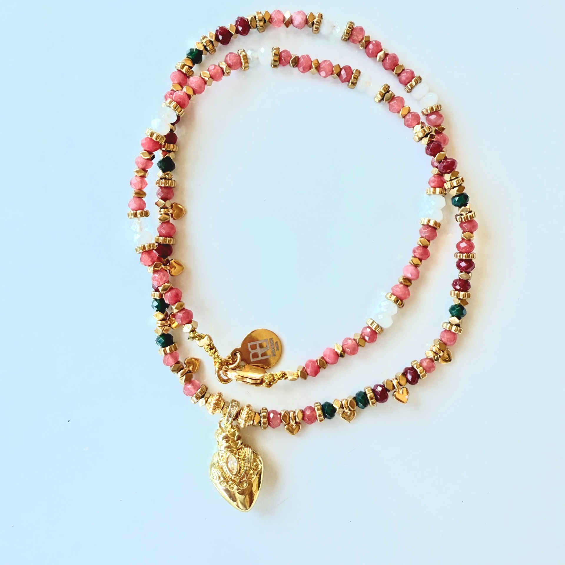 Colar Madalena, feito com pedras semi preciosas moonstone, granadas vermelhas, ágatas rosa e ágatas verdes. Mini pendentes coração, hematites e pendente coração com banho de ouro 18Kt e zircónias brancas.