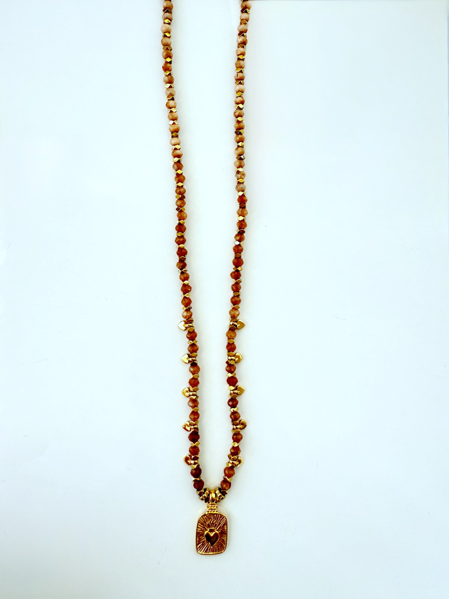 Pedra de lua pêssego. Hematites, pendentes coração e pendente chapa em zamak com banho de ouro 18Kt.