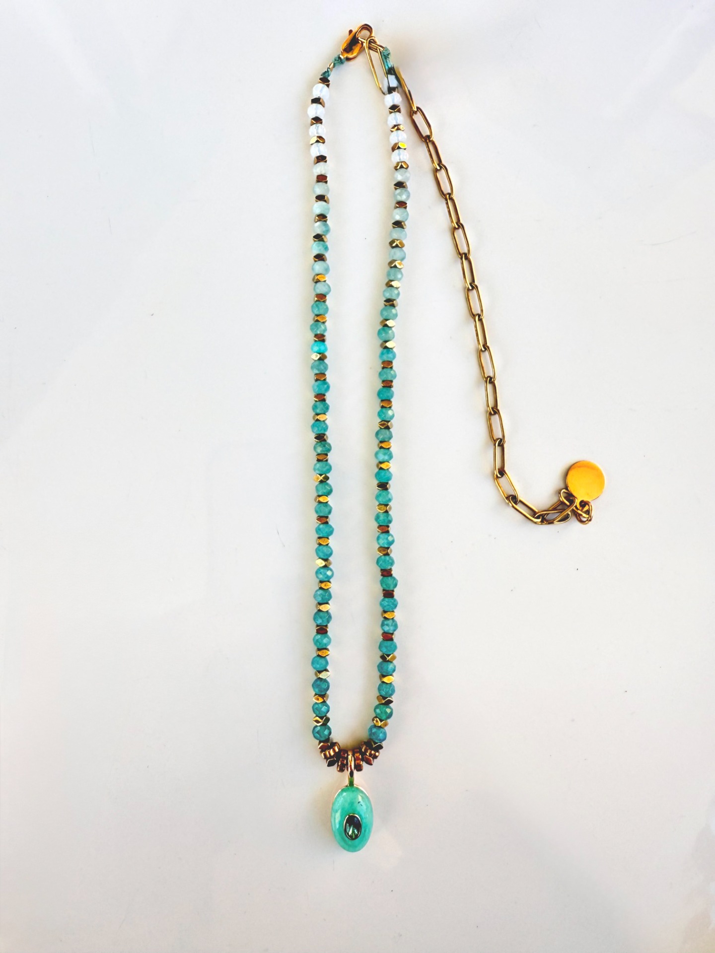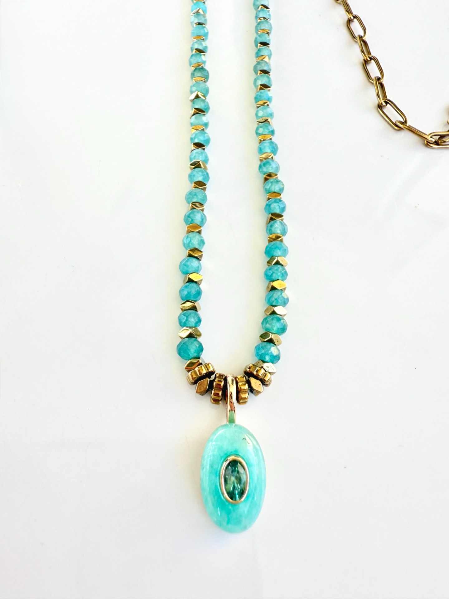 Amazonites e hematites com banho de ouro 18Kt. Pendente Amazonite com zircónia.