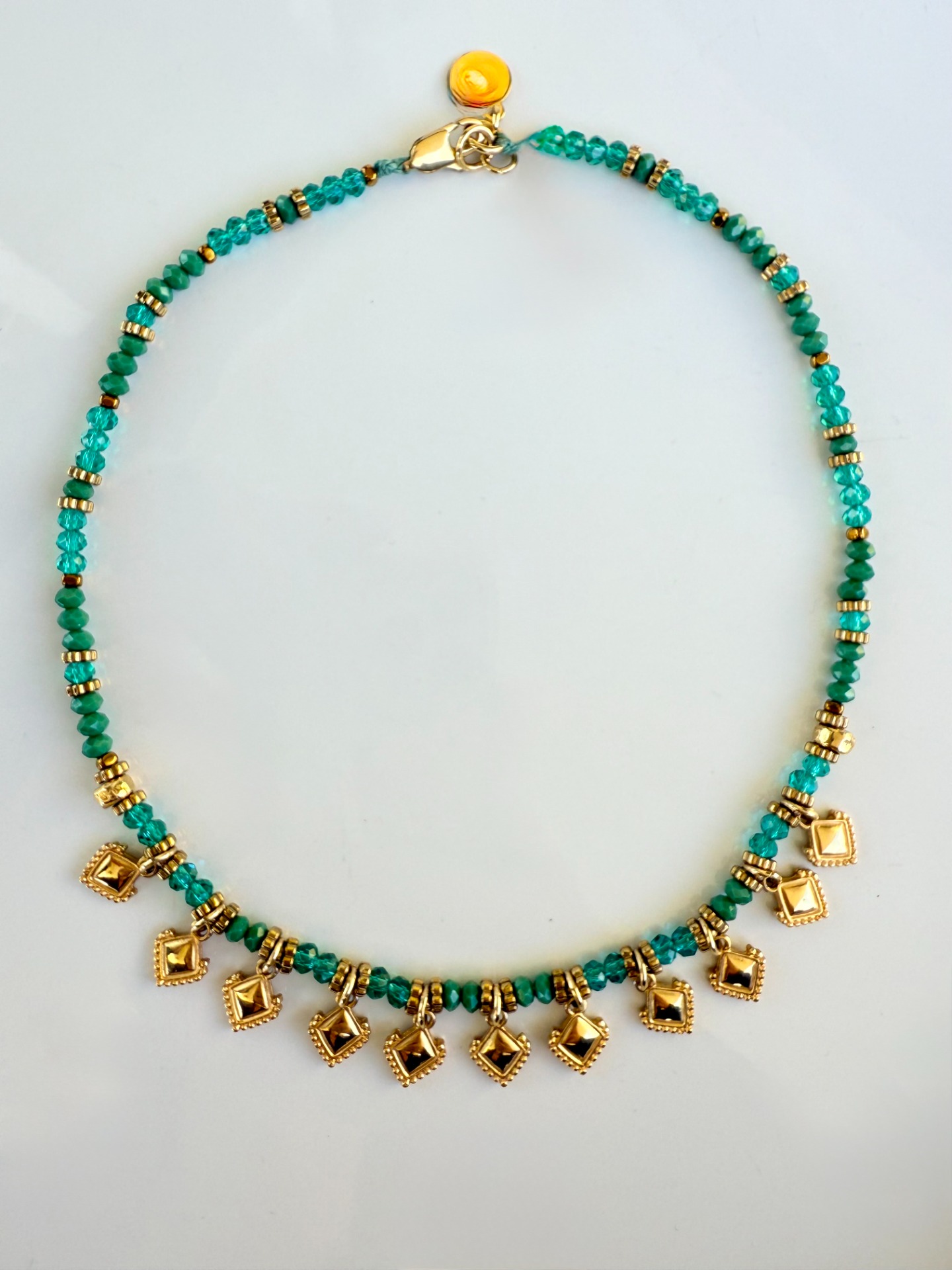 Cristais da bulgária verdes, hematites e pendentes tribais com banho de ouro 18Kt.