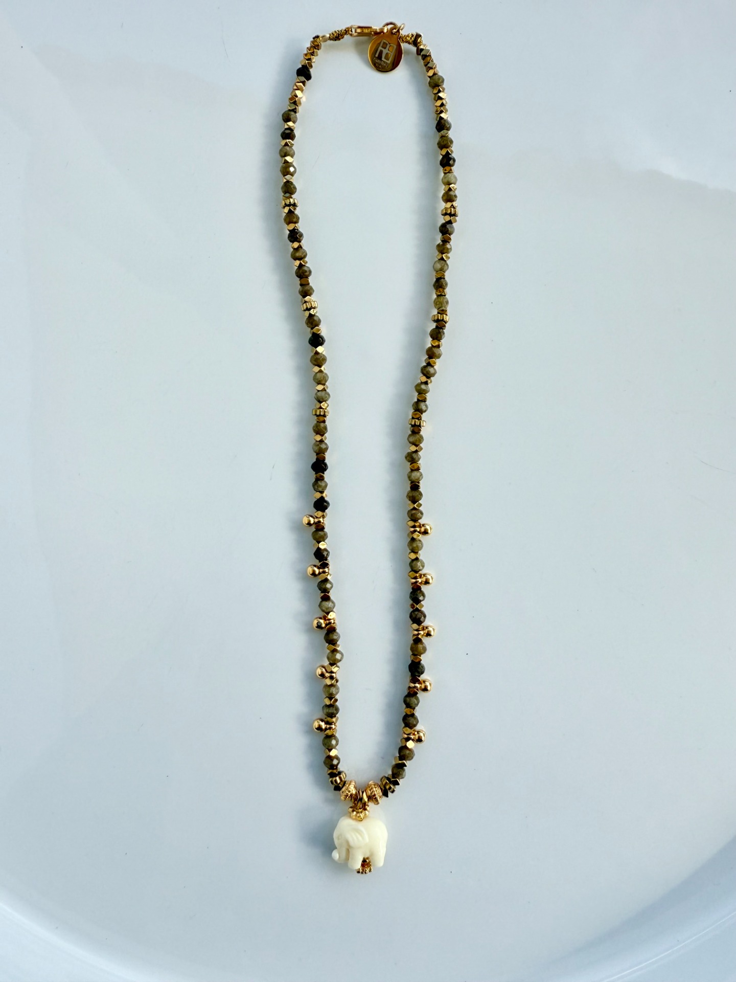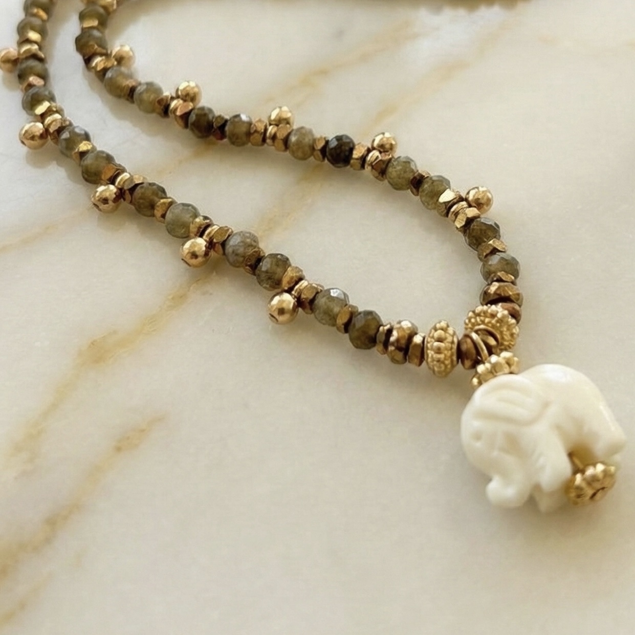 Labradorites verdes, hematites e pendentes bolinha com banho de ouro 18Kt. Pendente elefante.