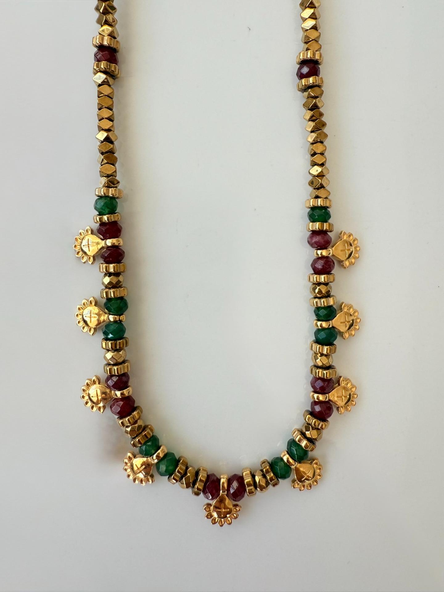 Pedras ágata vermelha e granada vermelha. Hematites e pendentes flor tribal com banho de ouro 18Kt.