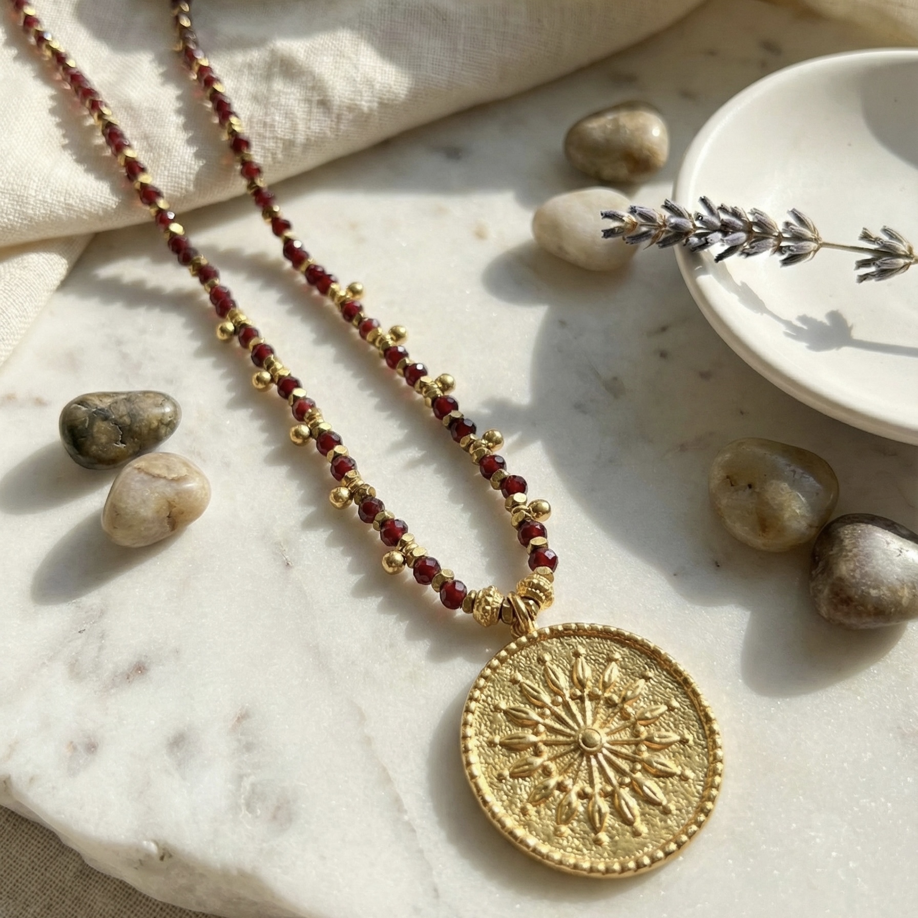 Pedras granada vermelha, hematites, mini pendentes bolinha e medalhão com banho de ouro 18Kt.