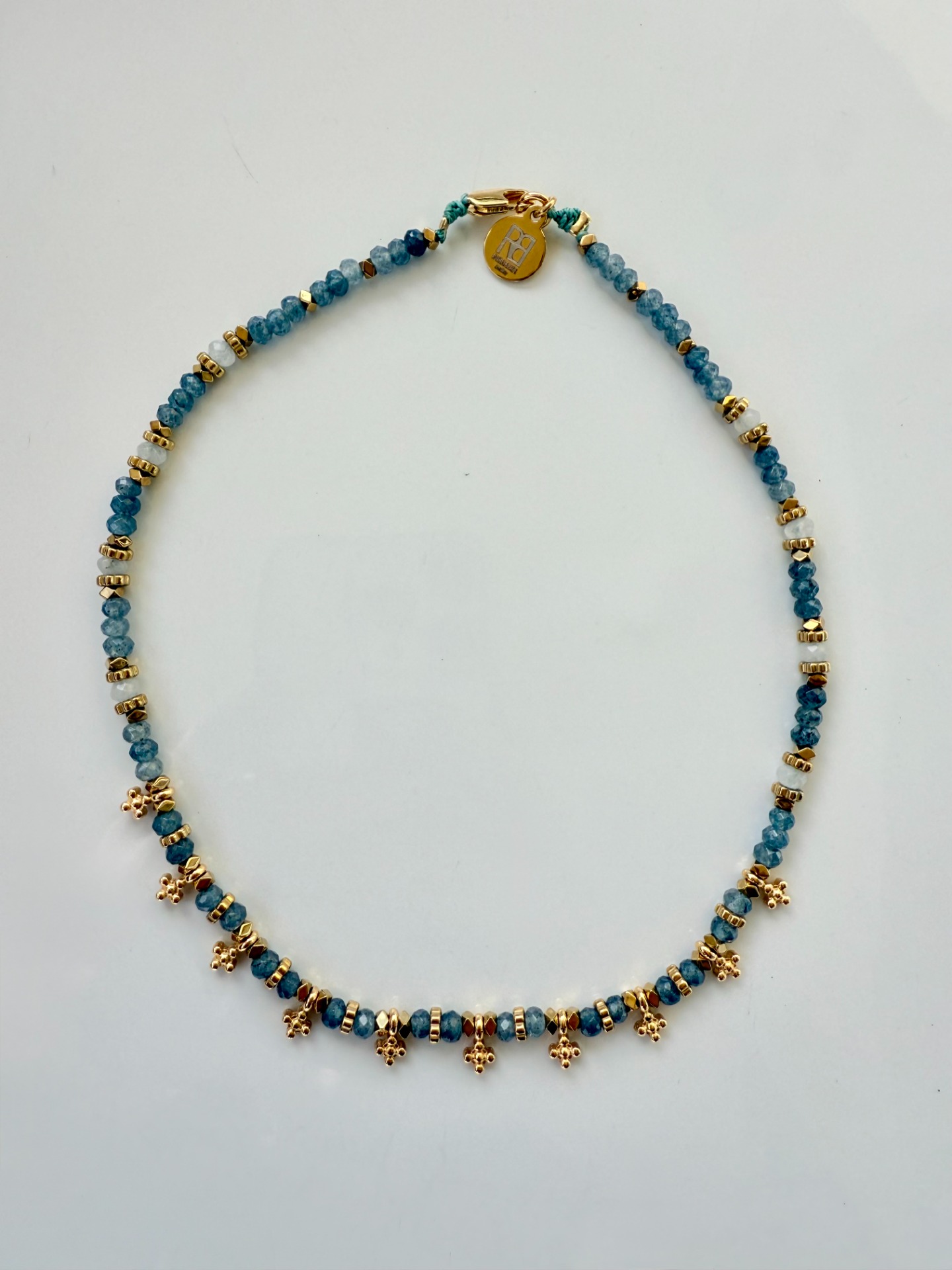 Iolitas azuis, moonstone, hematites e pendentes cruzinha com banho de ouro 18Kt.