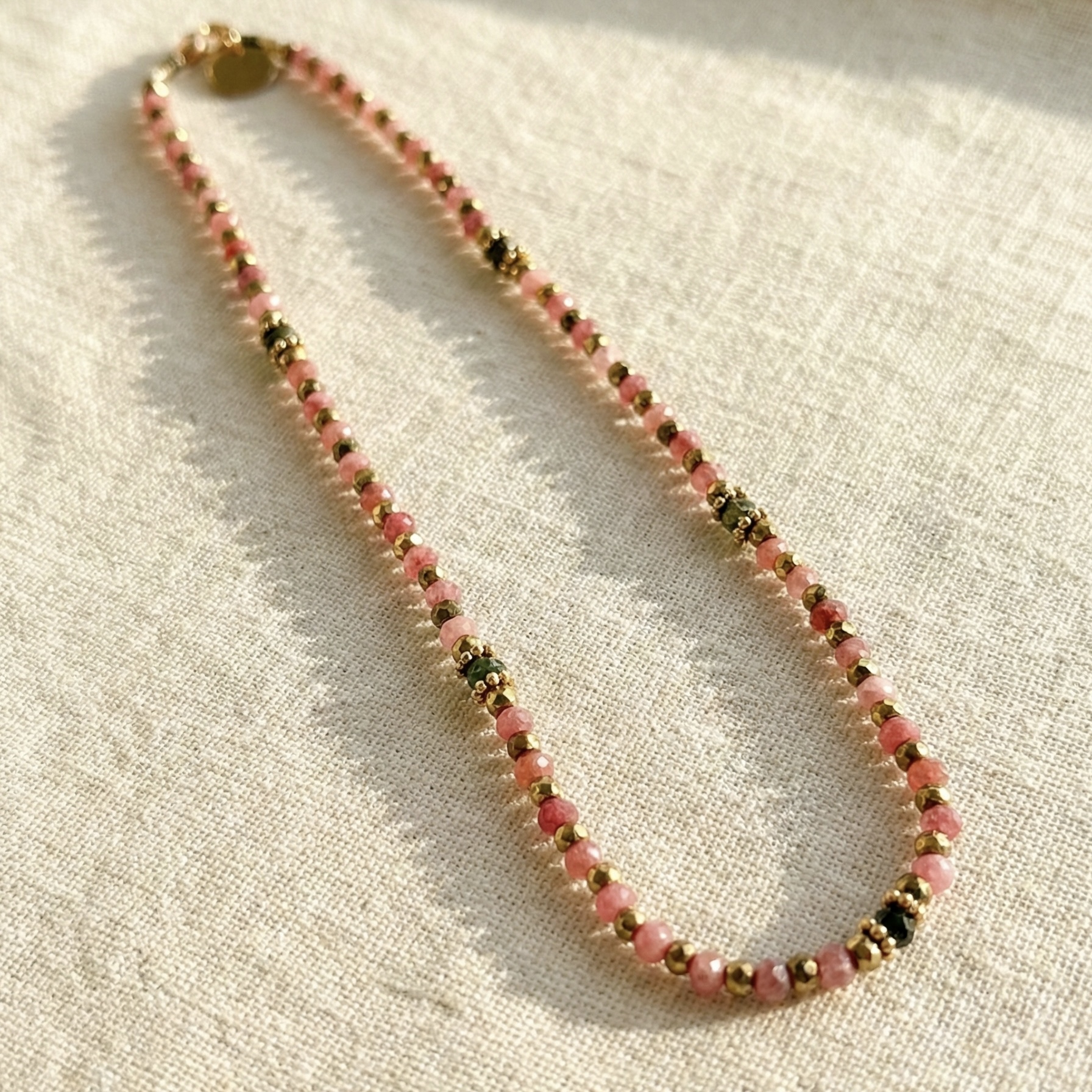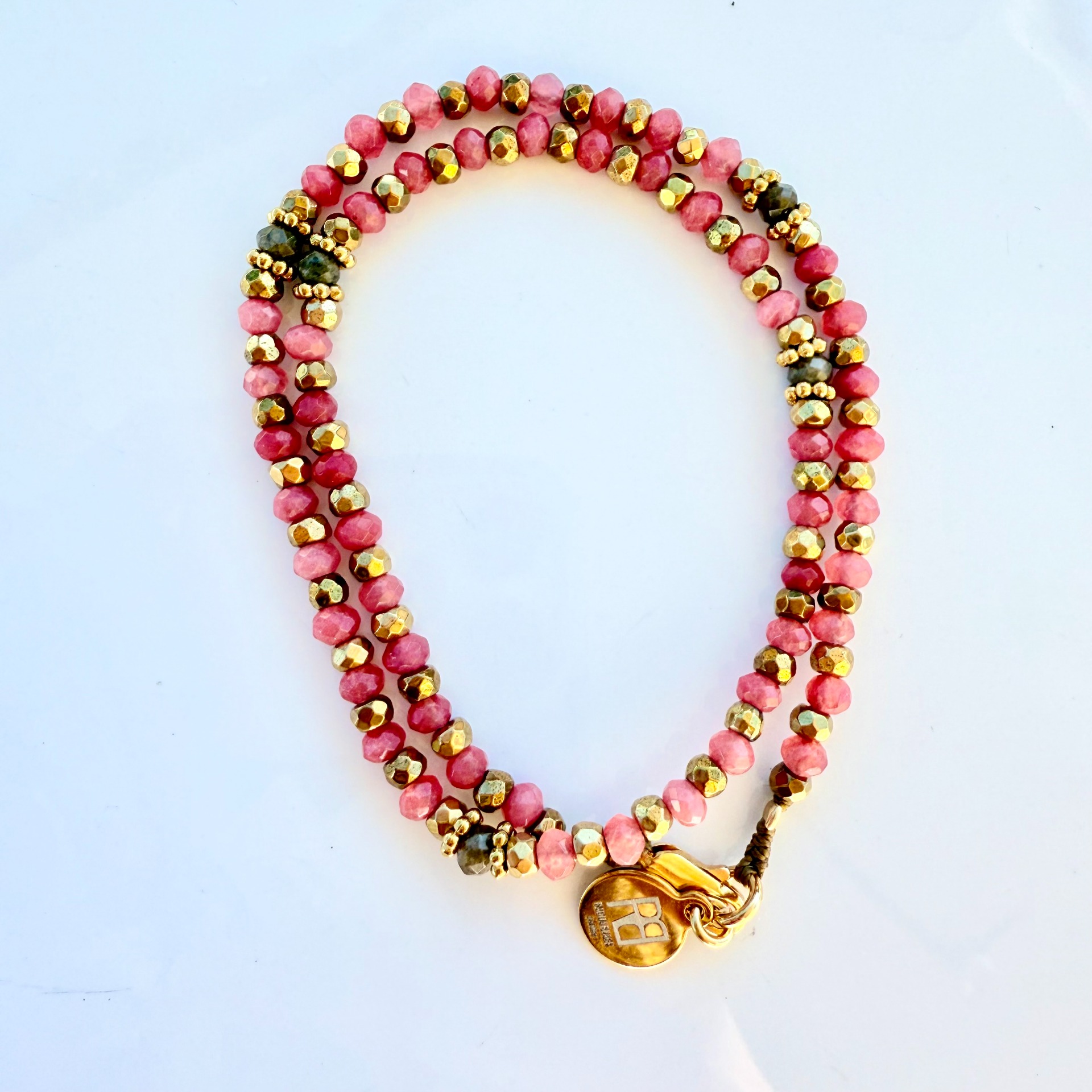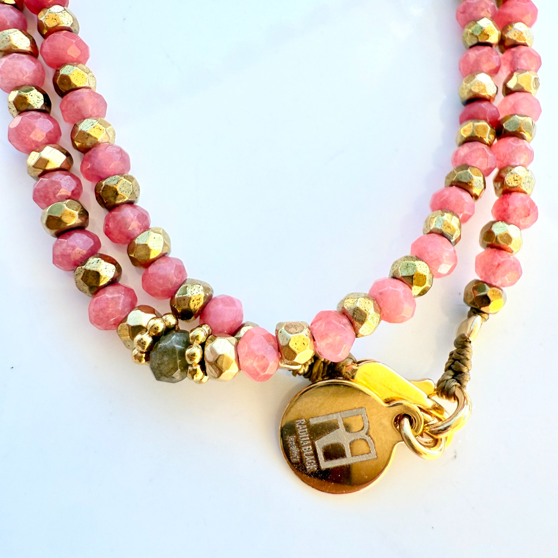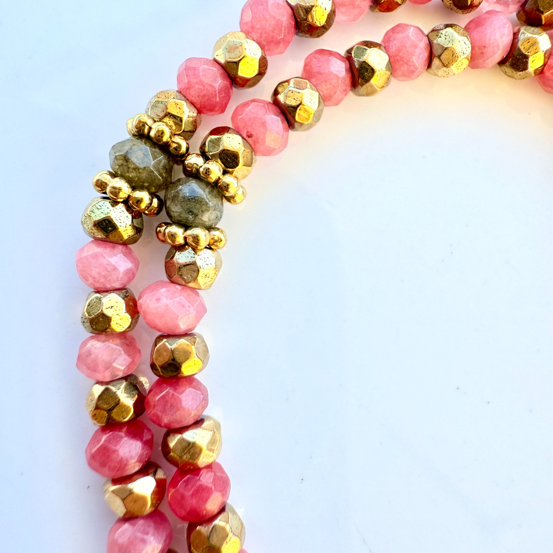 Pedras semi preciosas jade cor-de-rosa. Labradorites. Hematites com banho de ouro 18Kt.