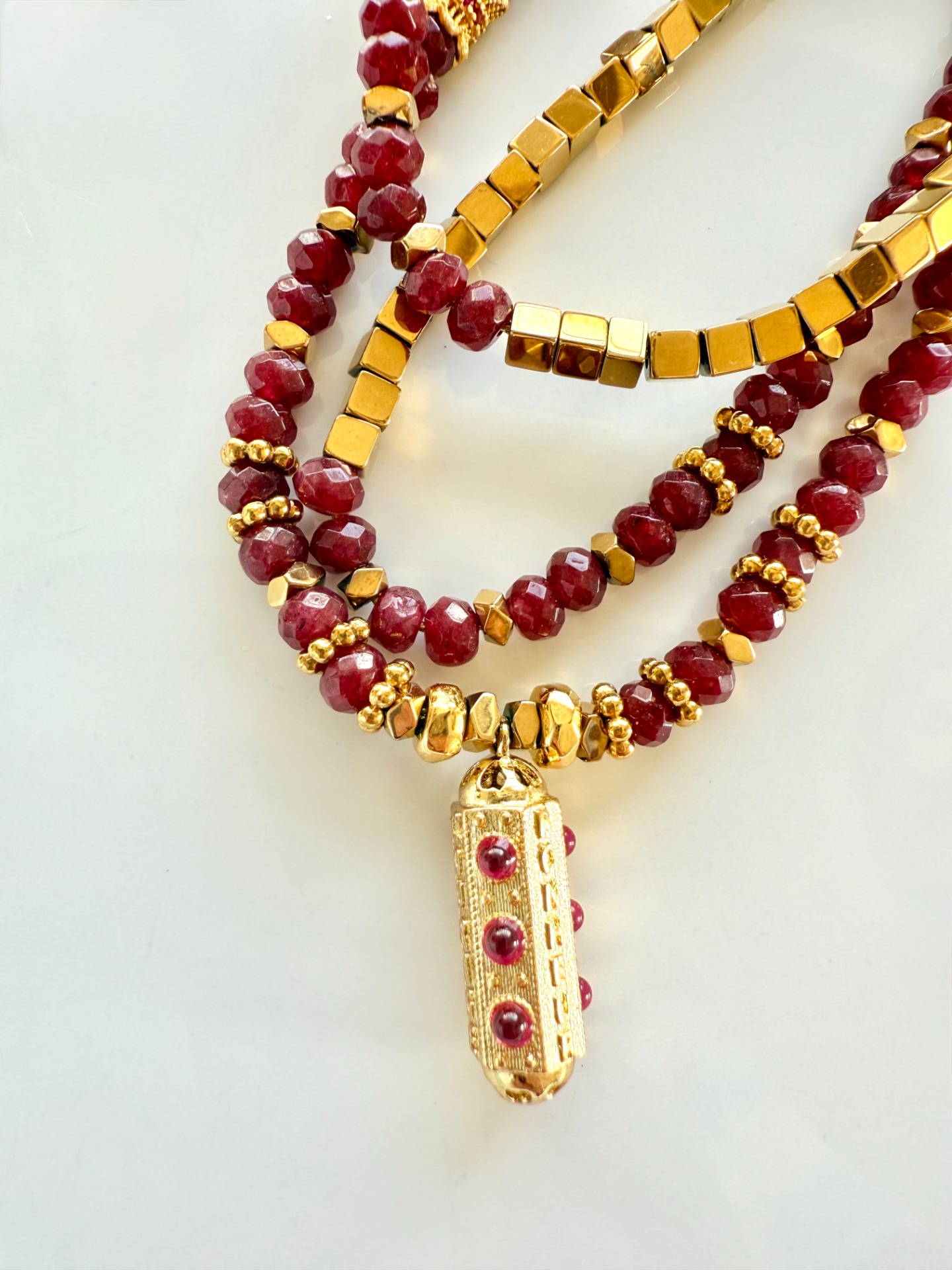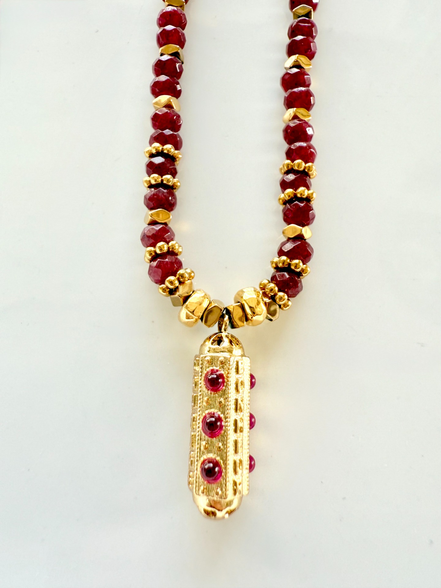 Pedras granada vermelha e spacers com zircónias. Hemtites e pendente lanterna com banho de ouro 18Kt.
