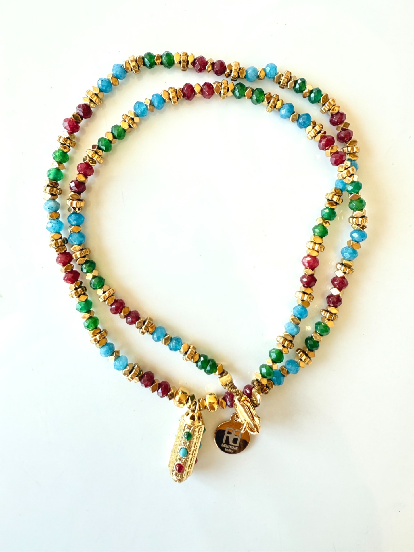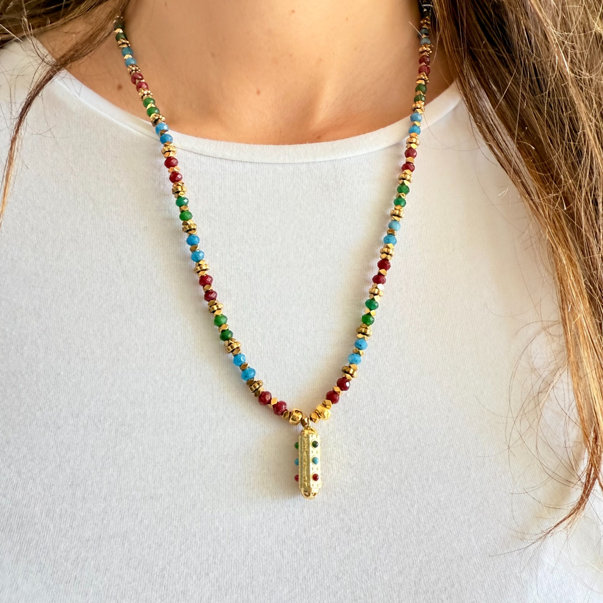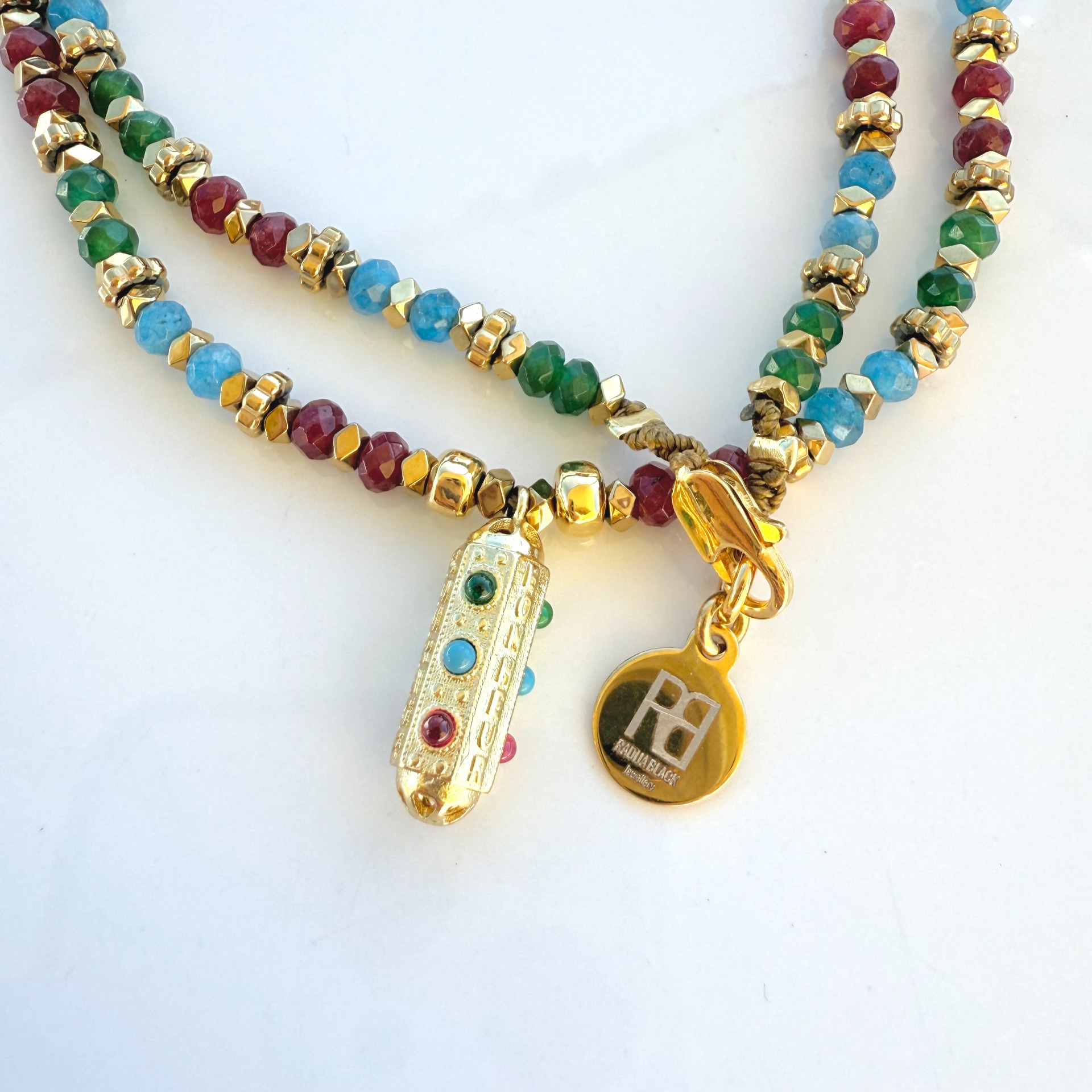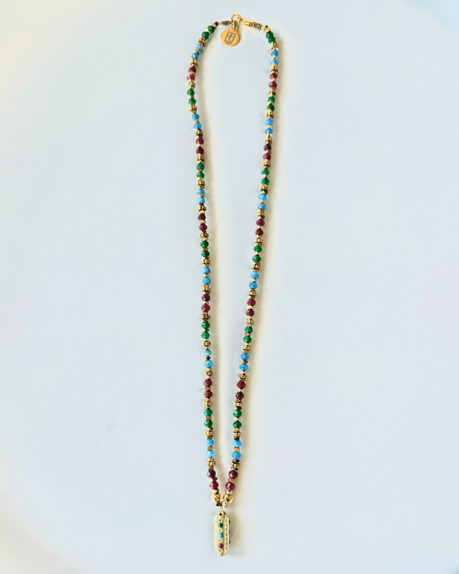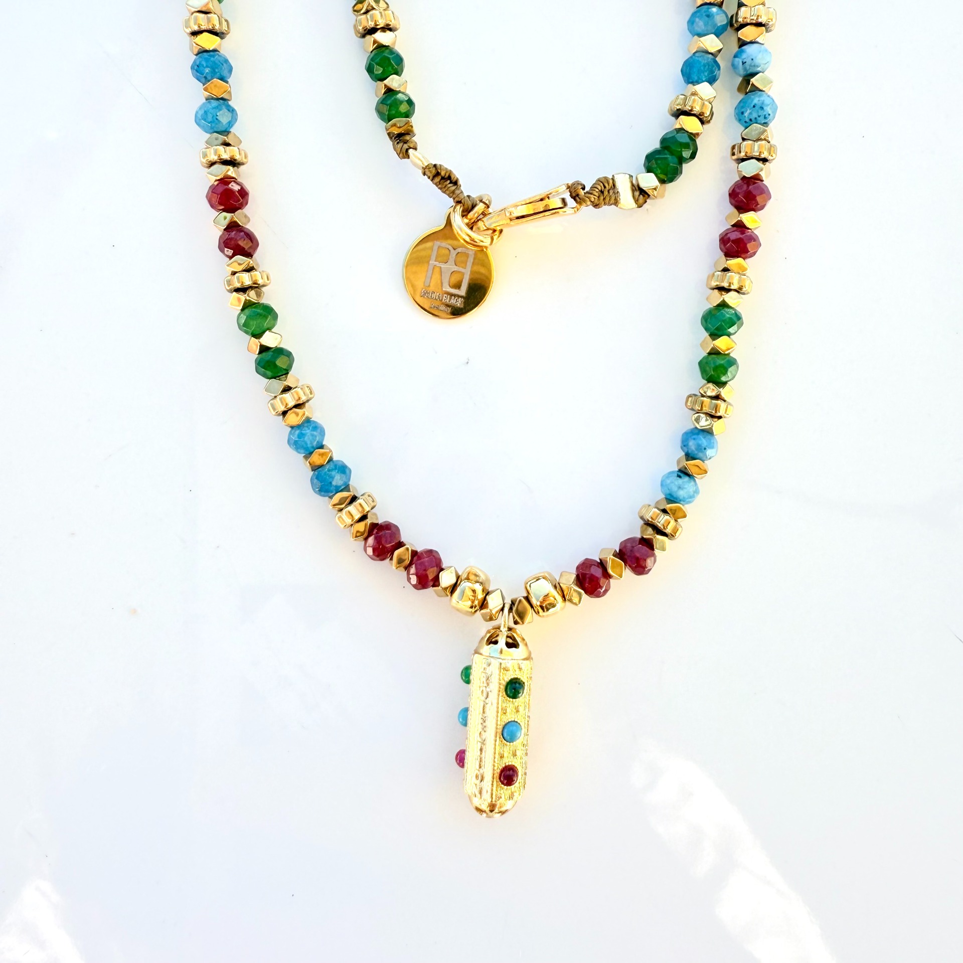 Pedras ágatas verdes, granada vermelha, apatita. Hematites e pendente lanterna com banho de ouro 18Kt.