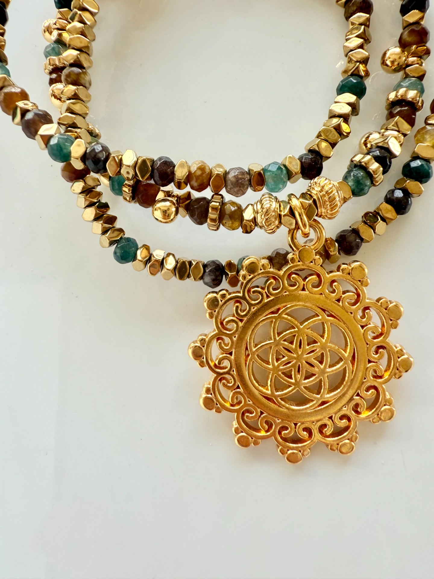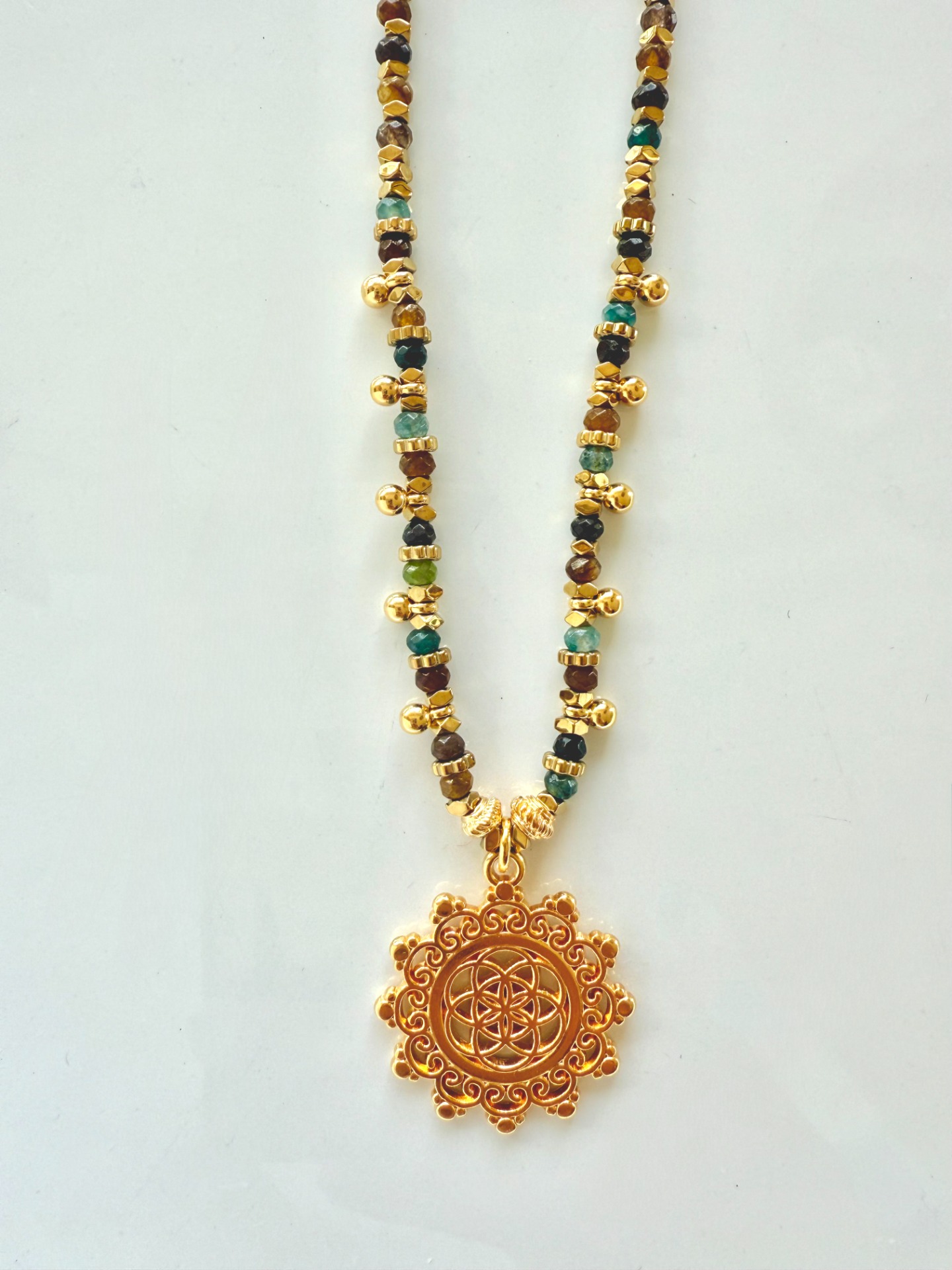 Pedras aventurina. Hematites, mini pendentes bolinha e pendente mandala com banho de ouro 18Kt.