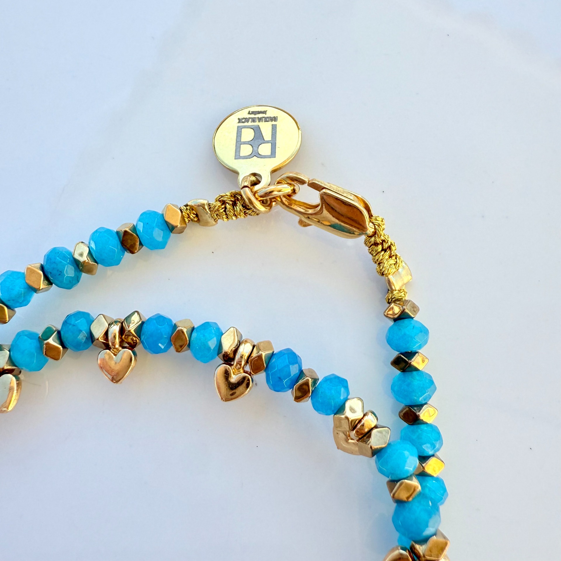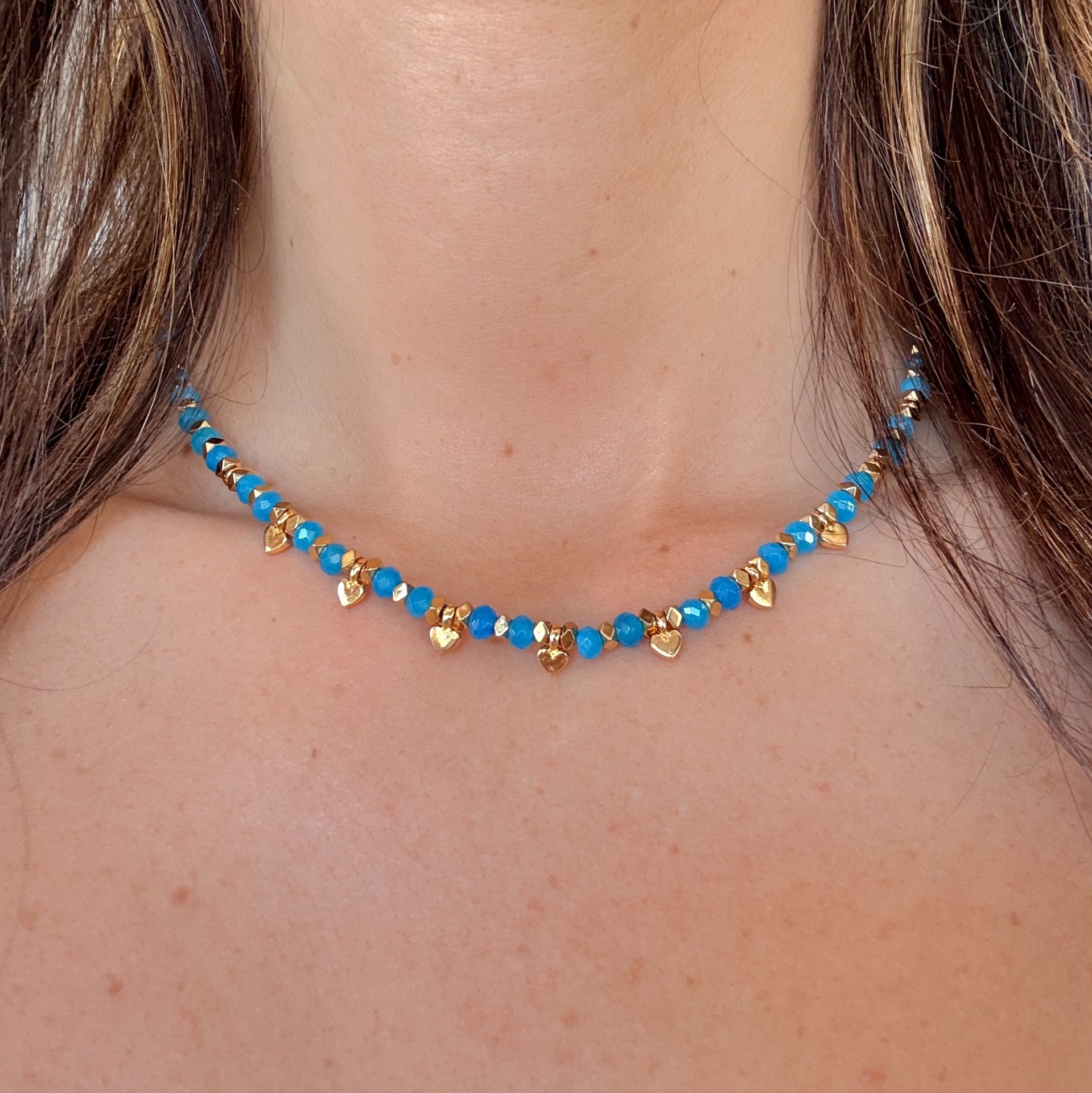 Pedras Apatita, hematites e mini pendentes coração com banho de ouro 18Kt.