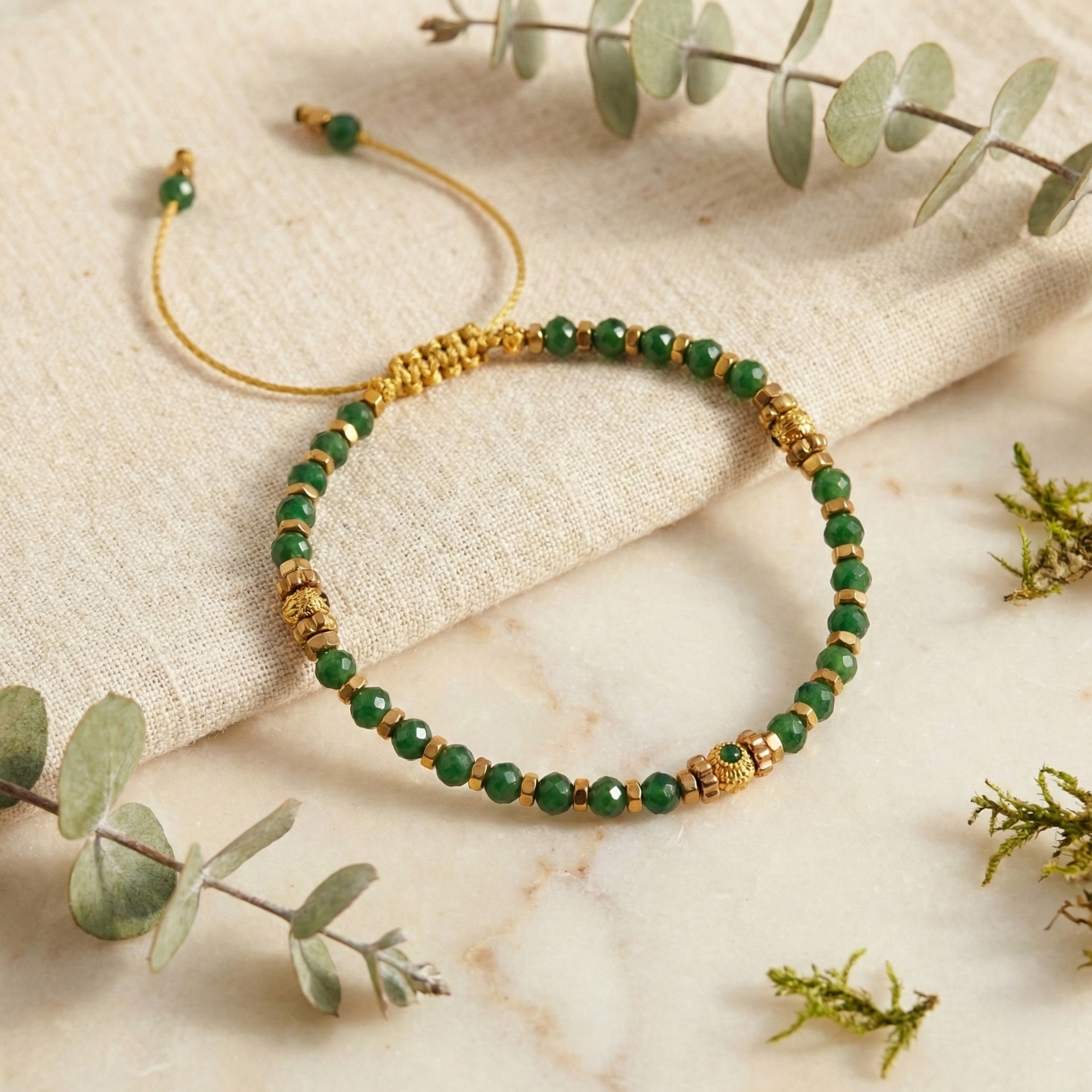 Pedras semi preciosas ágatas verdes. Spacers olho verde em latão, hematites e spacers flôr com banho de ouro 18Kt.