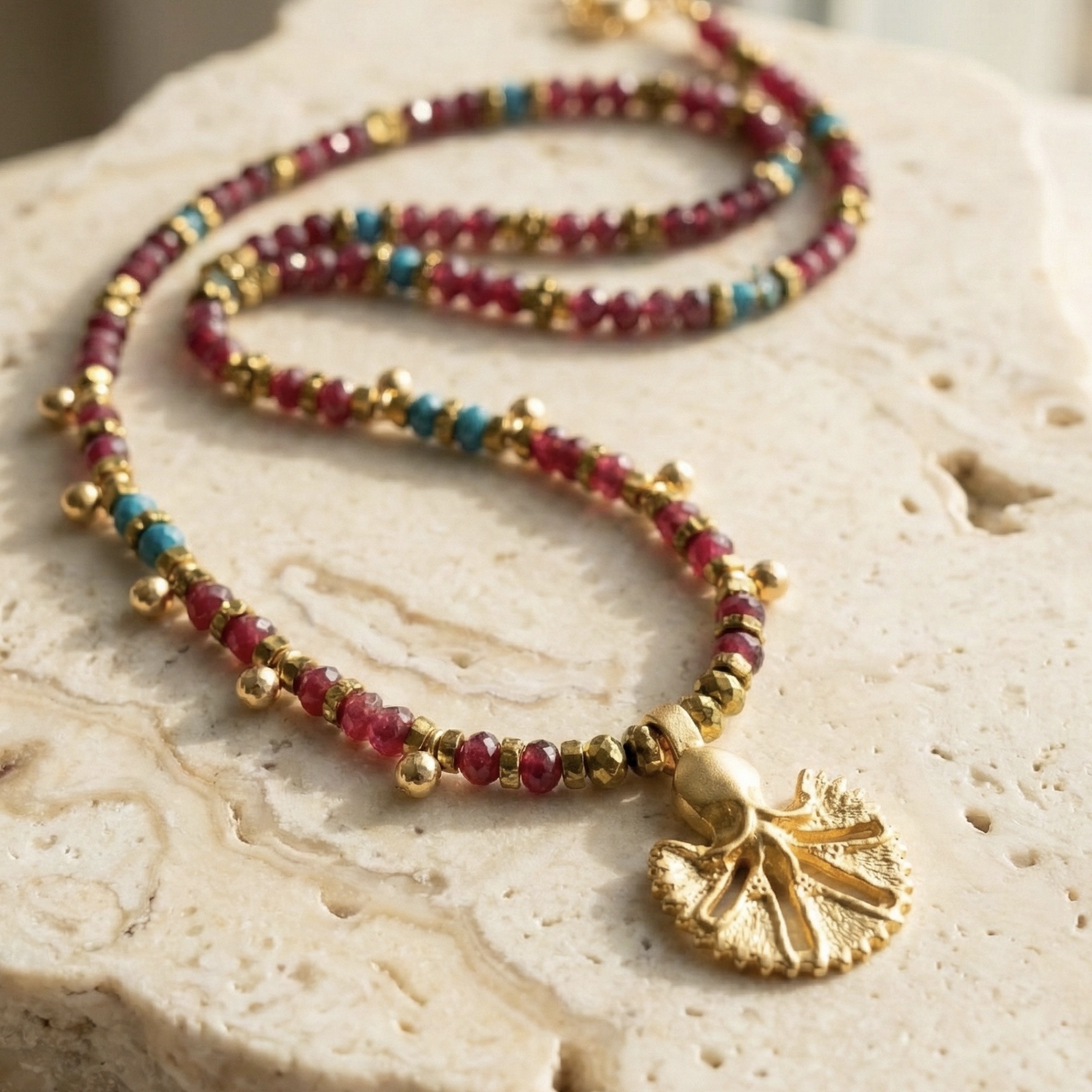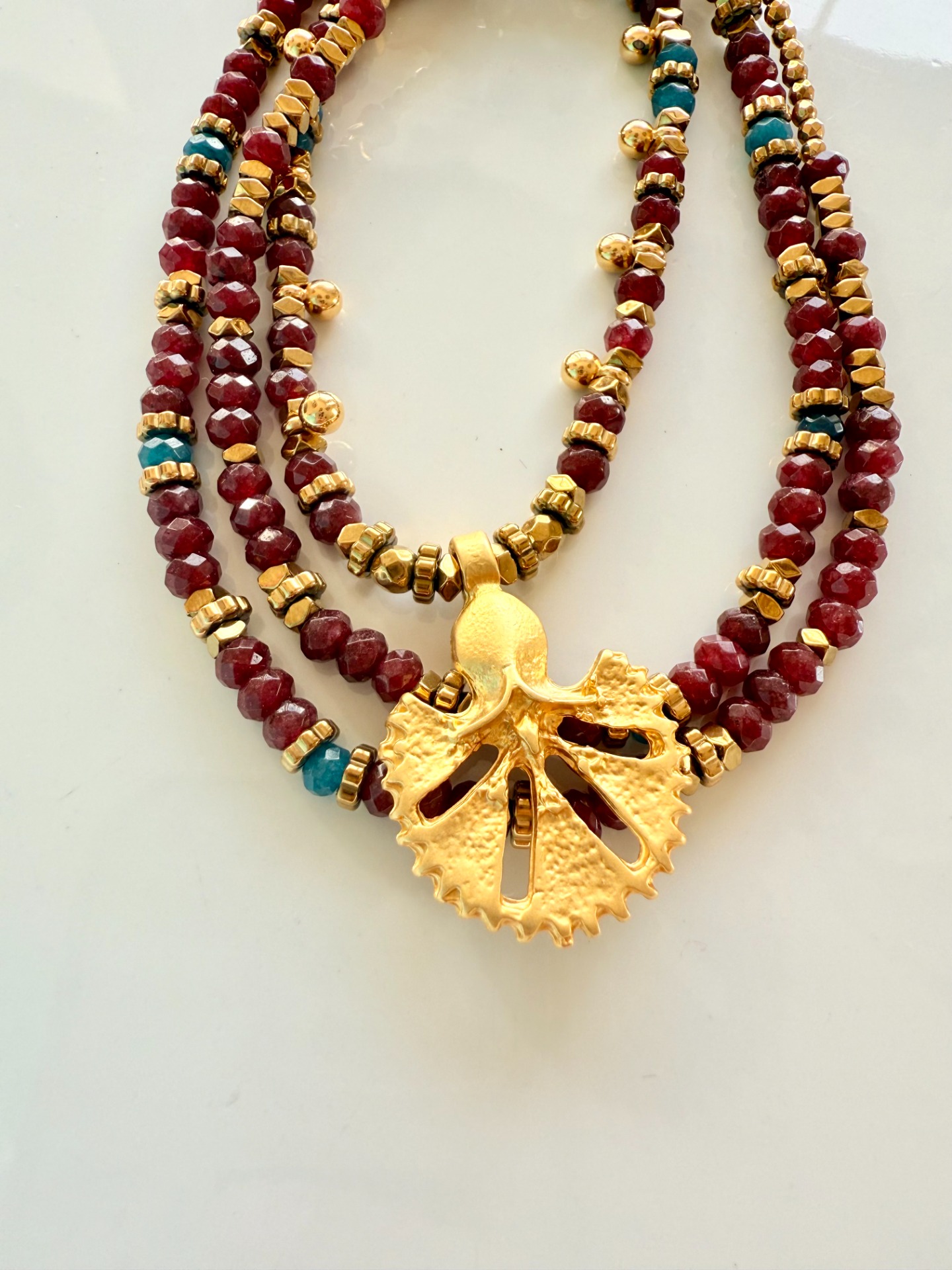 Pedras granada vermelha e ágata azul. Hematites, mini pendentes bolinha e pendente pavão com banho de ouro 18Kt.
