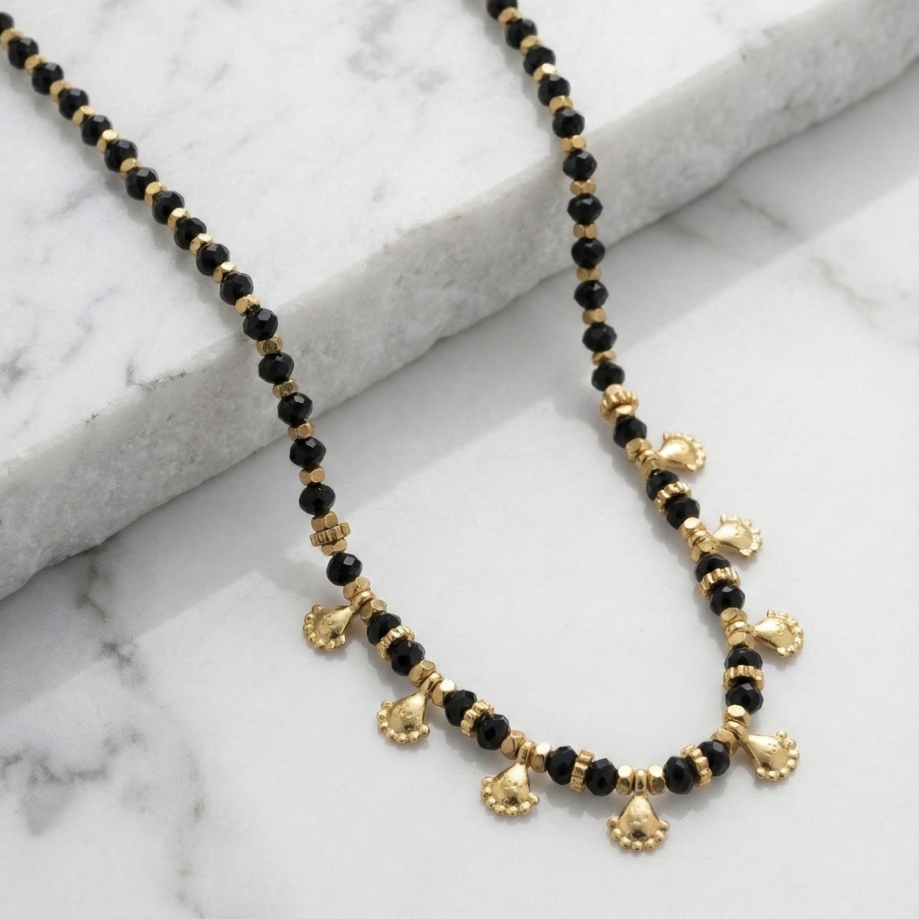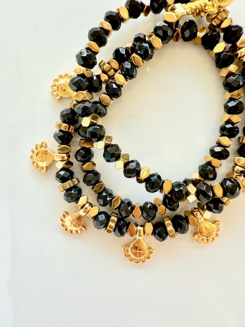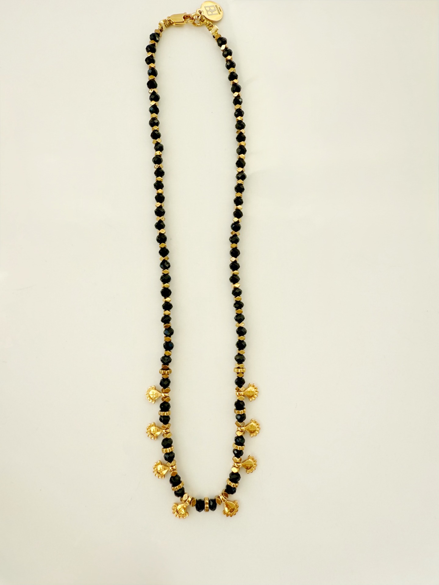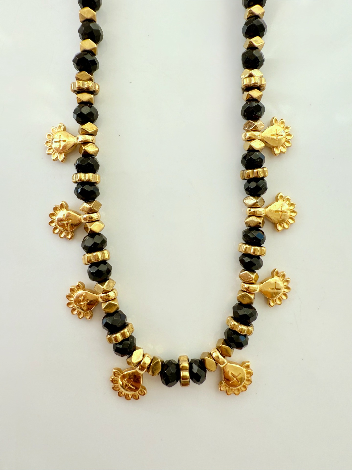 Colar feito com pedras ónix, hematites pendentes flor tribal e spacers flor com banho de ouro 18Kt.
