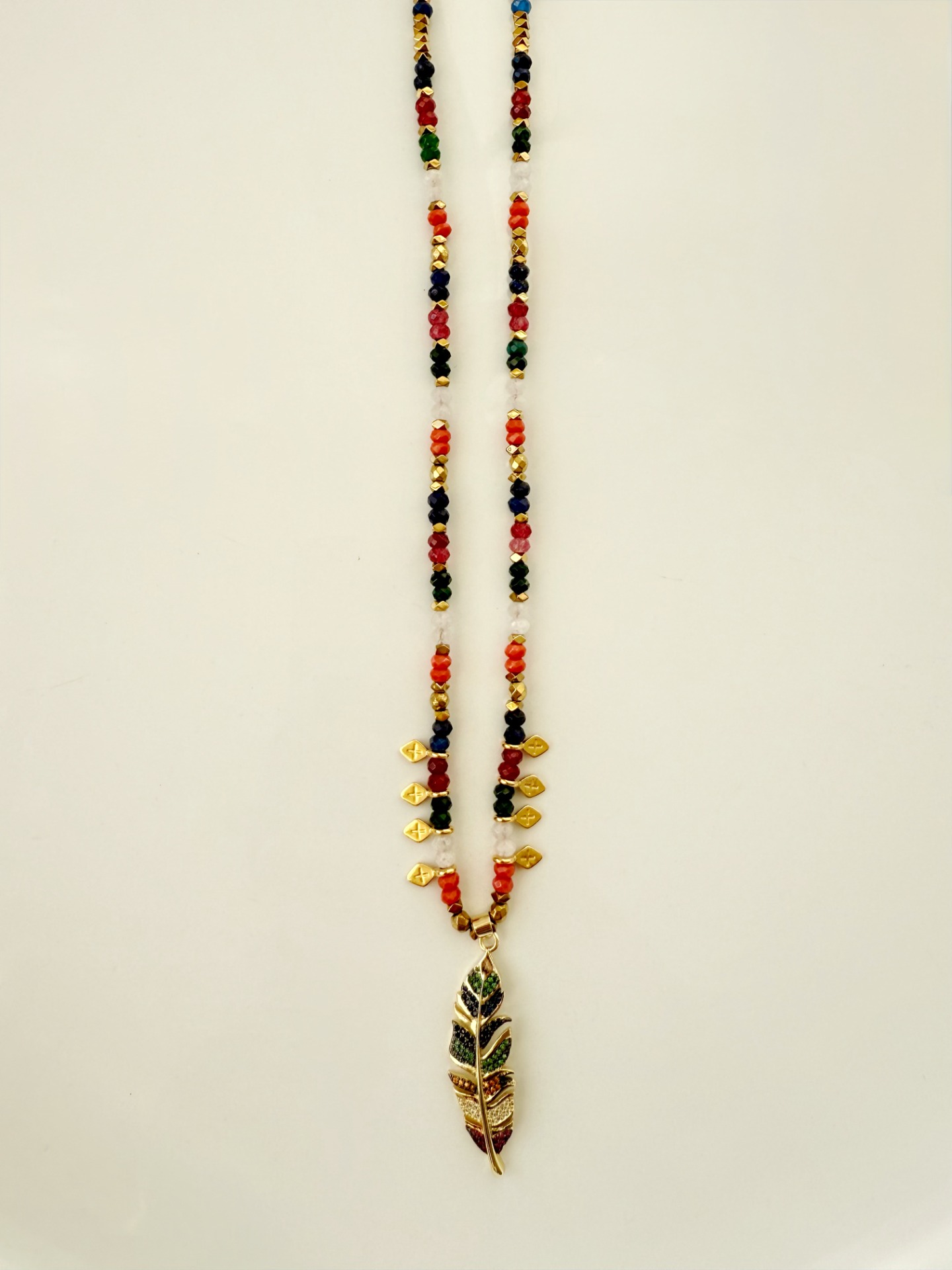 Mistura de pedras semi preciosas. Mini pendentes tribais de zamak com banho de ouro 18Kt. Pendente pena com zircónias.