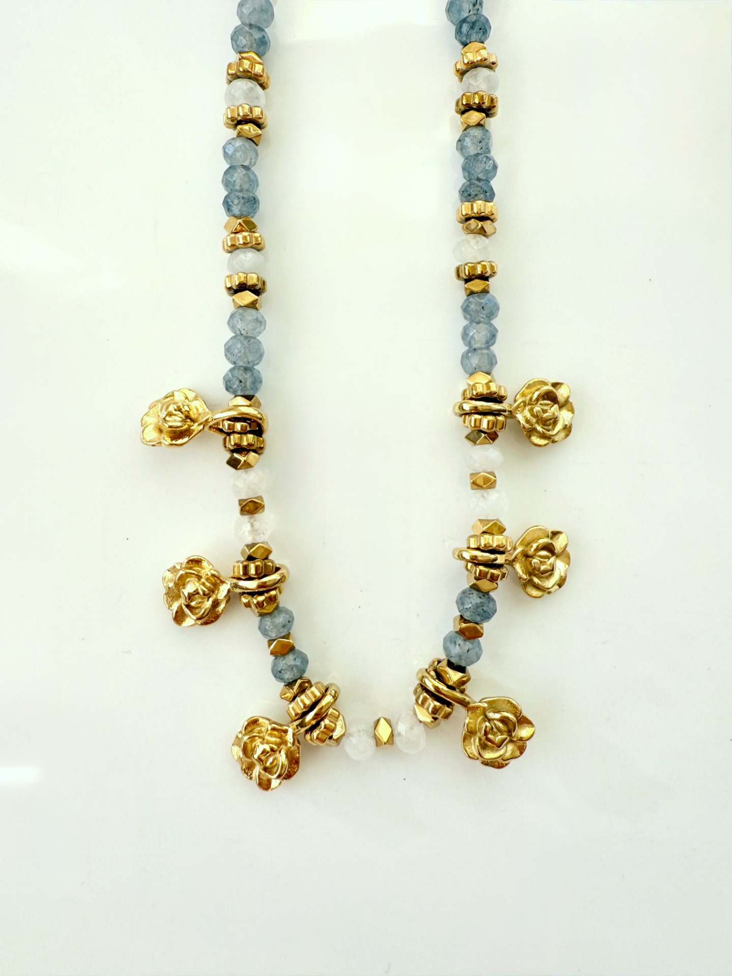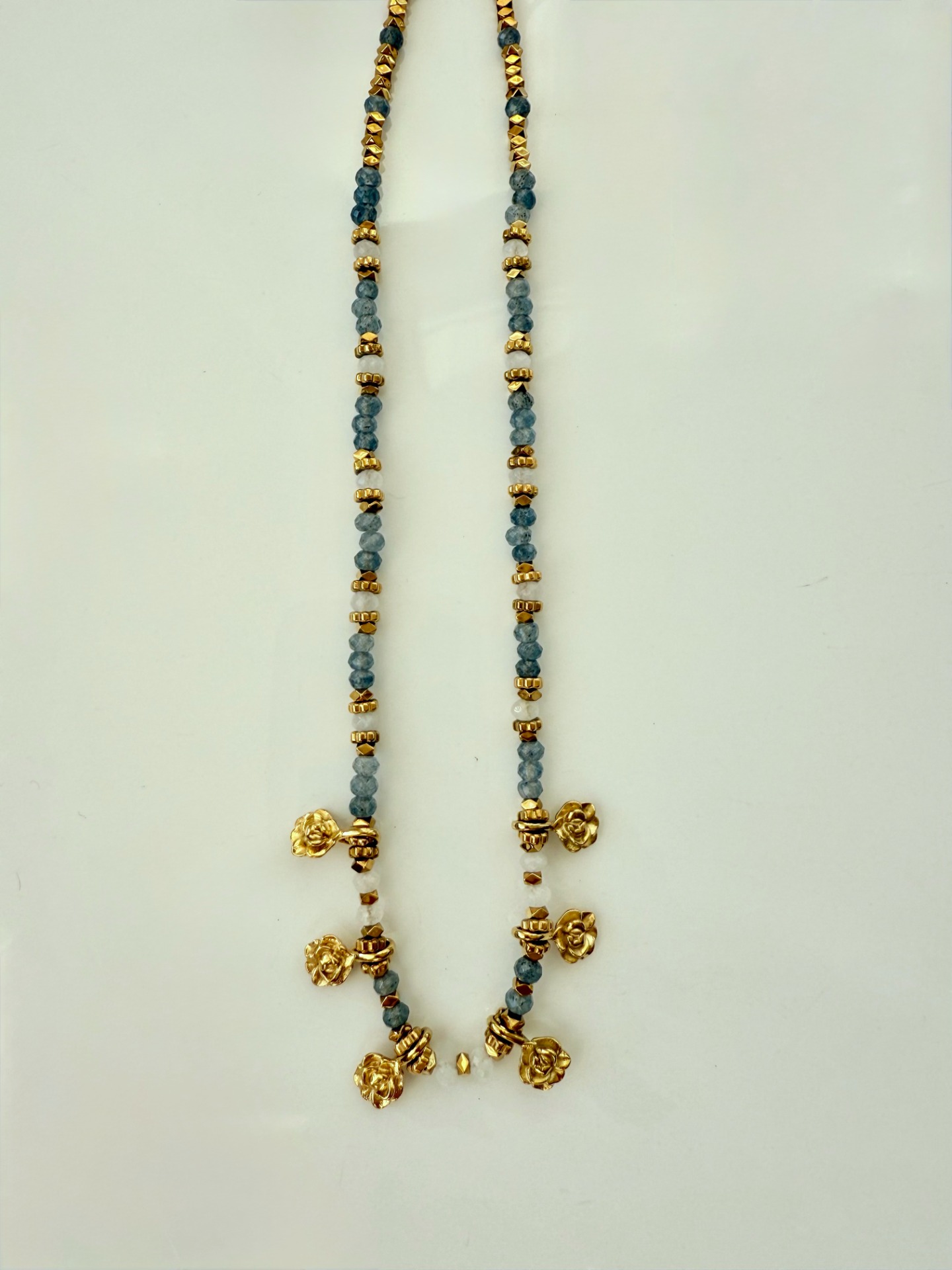 Pedras semi preciosas Iolita. Pendentes flôr e hematites com banho de ouro 18Kt.