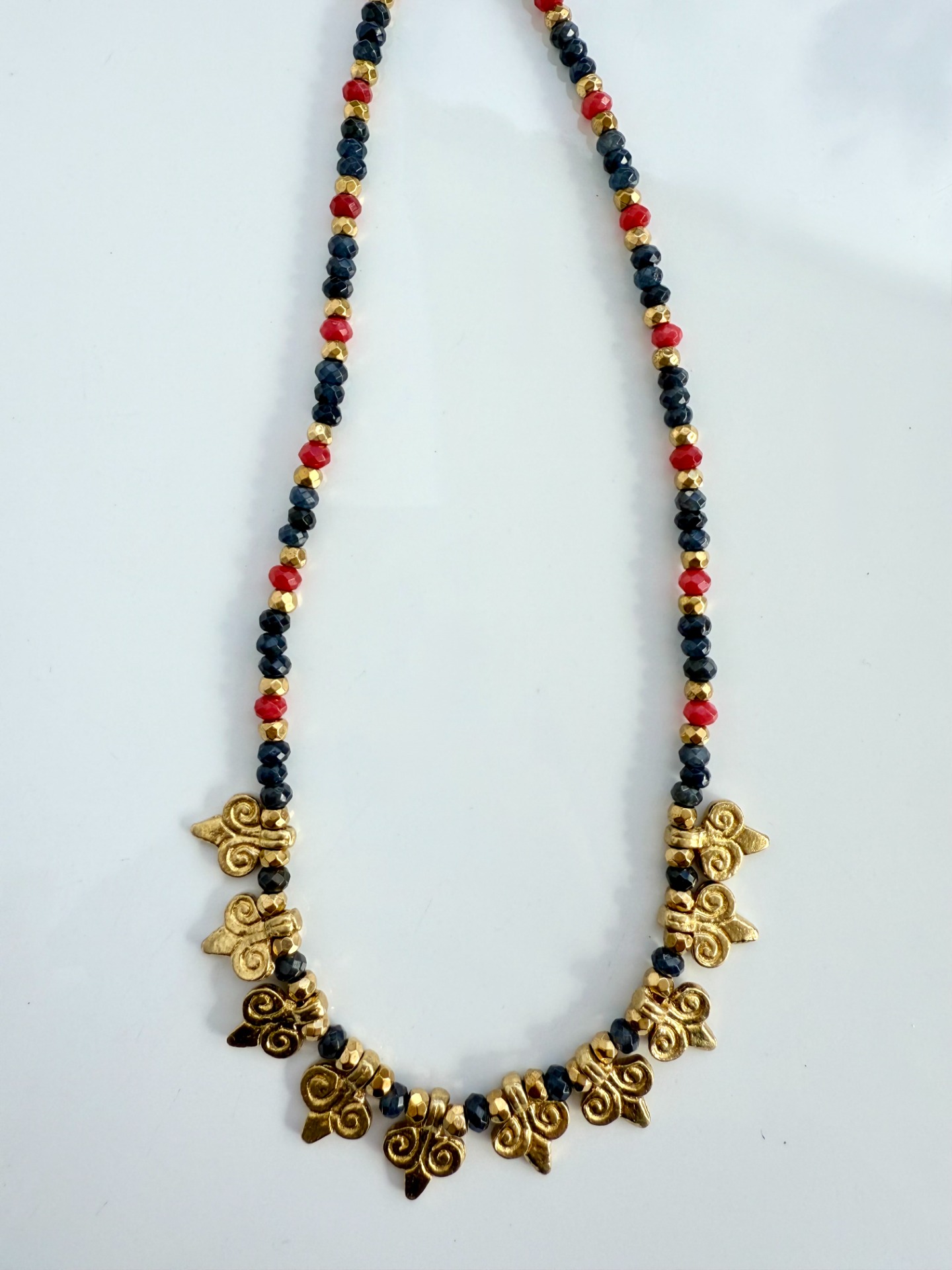 Pedras safiras, ágatas encarnadas, hematites e pendentes com banho de ouro 18Kt.