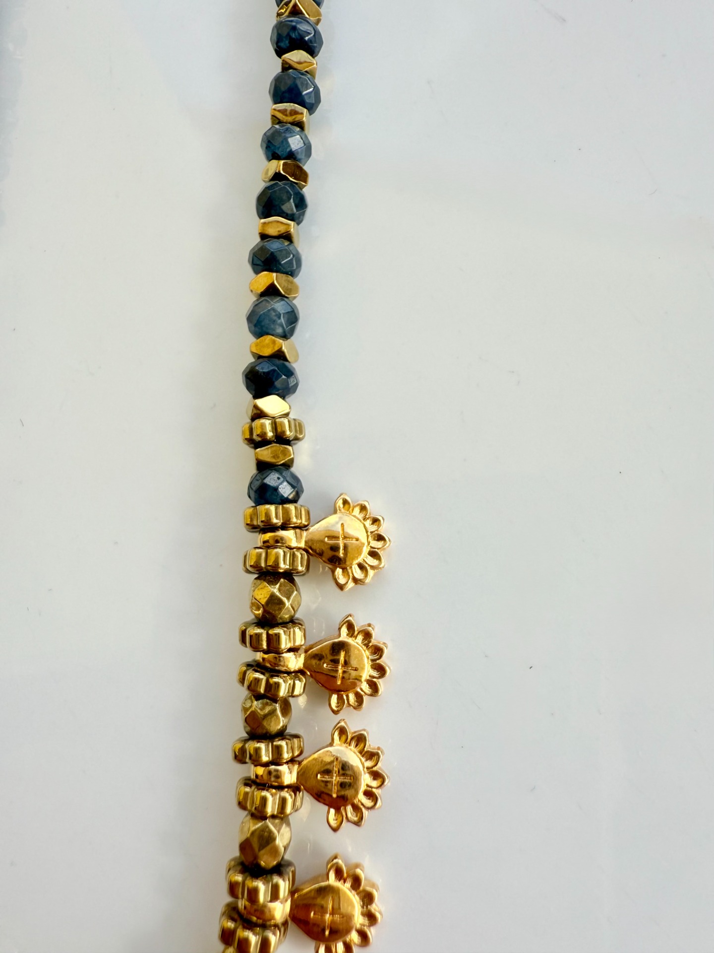 Pedras safiras, hematites e mini pendentes flôr tribal com banho de ouro 18Kt.