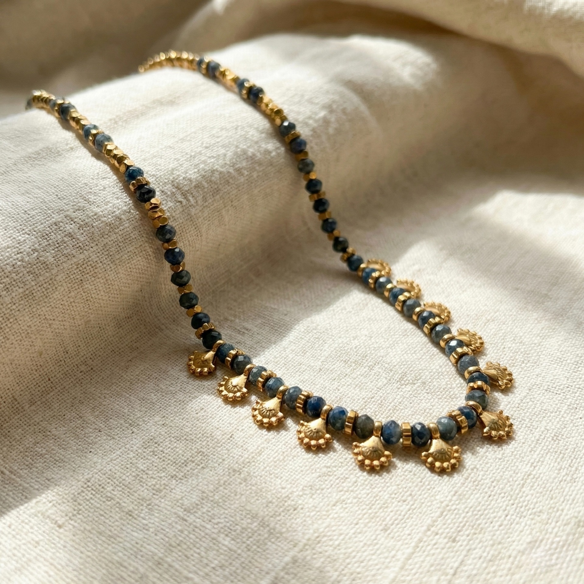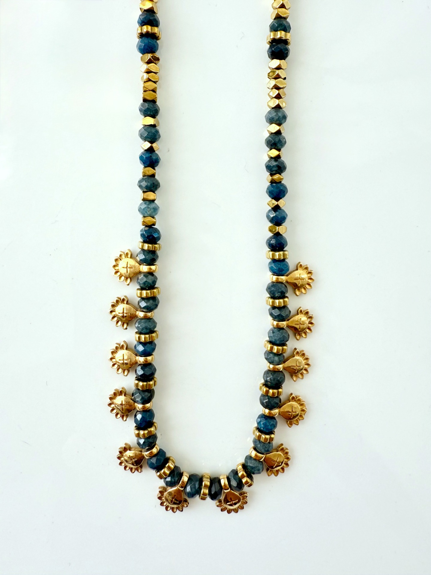 Pedras safiras. Hematites e mini pendentes sol tribal com banho de ouro 18Kt.