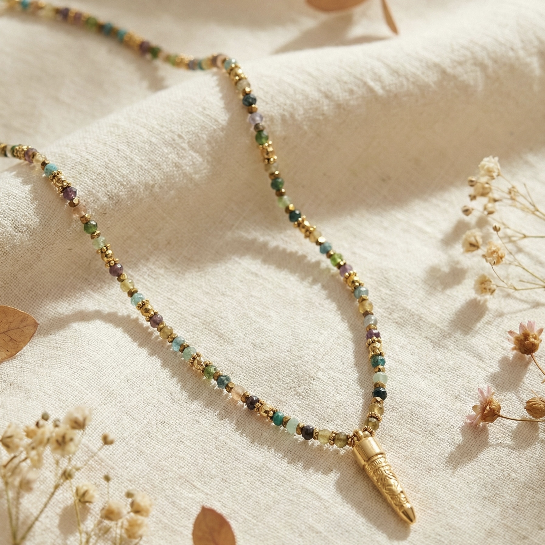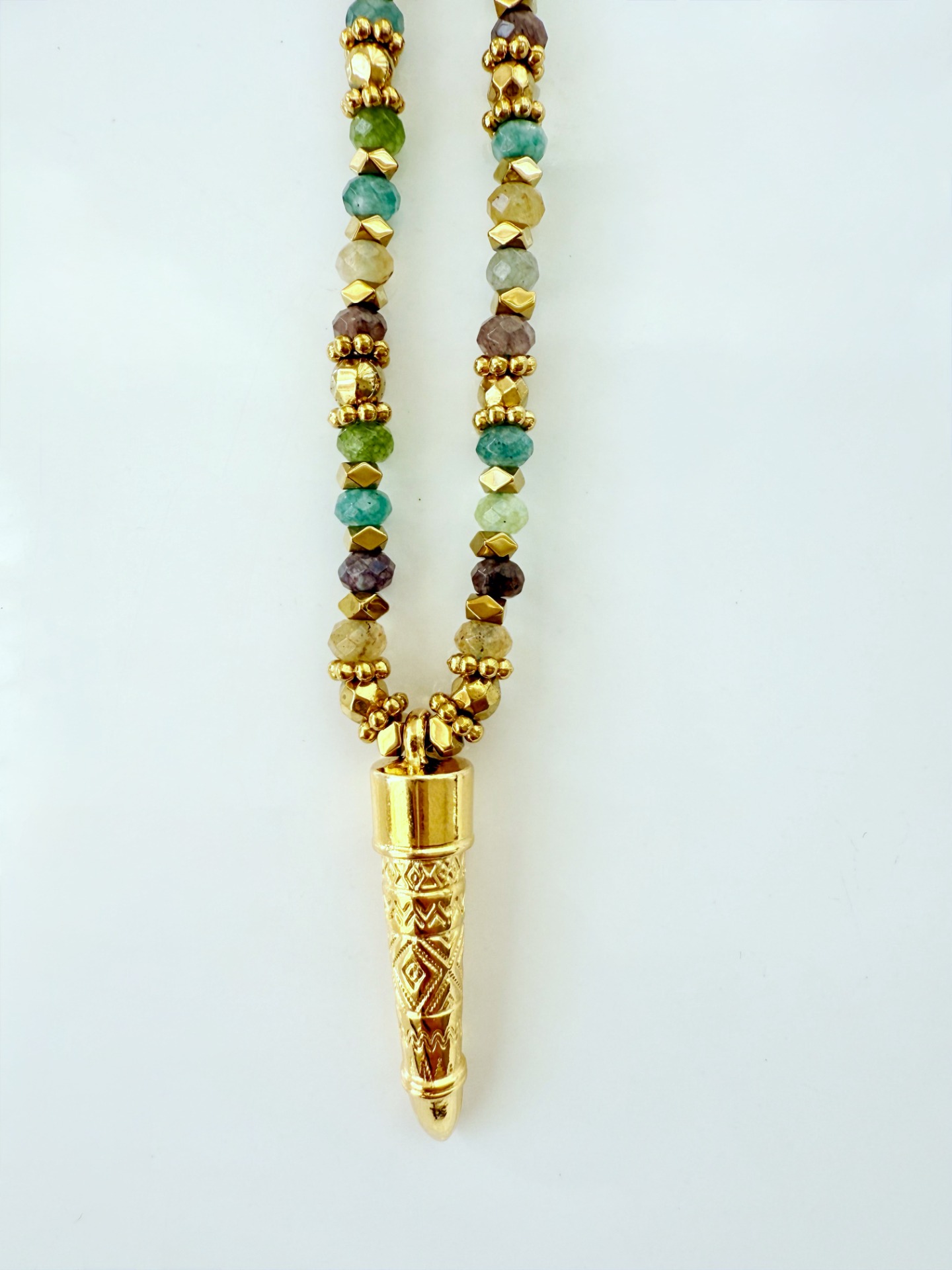 Colar de pedras semi preciosas turmalinas, com spacers flor e hematites formato bola de espelhos com banho de ouro 18Kt.